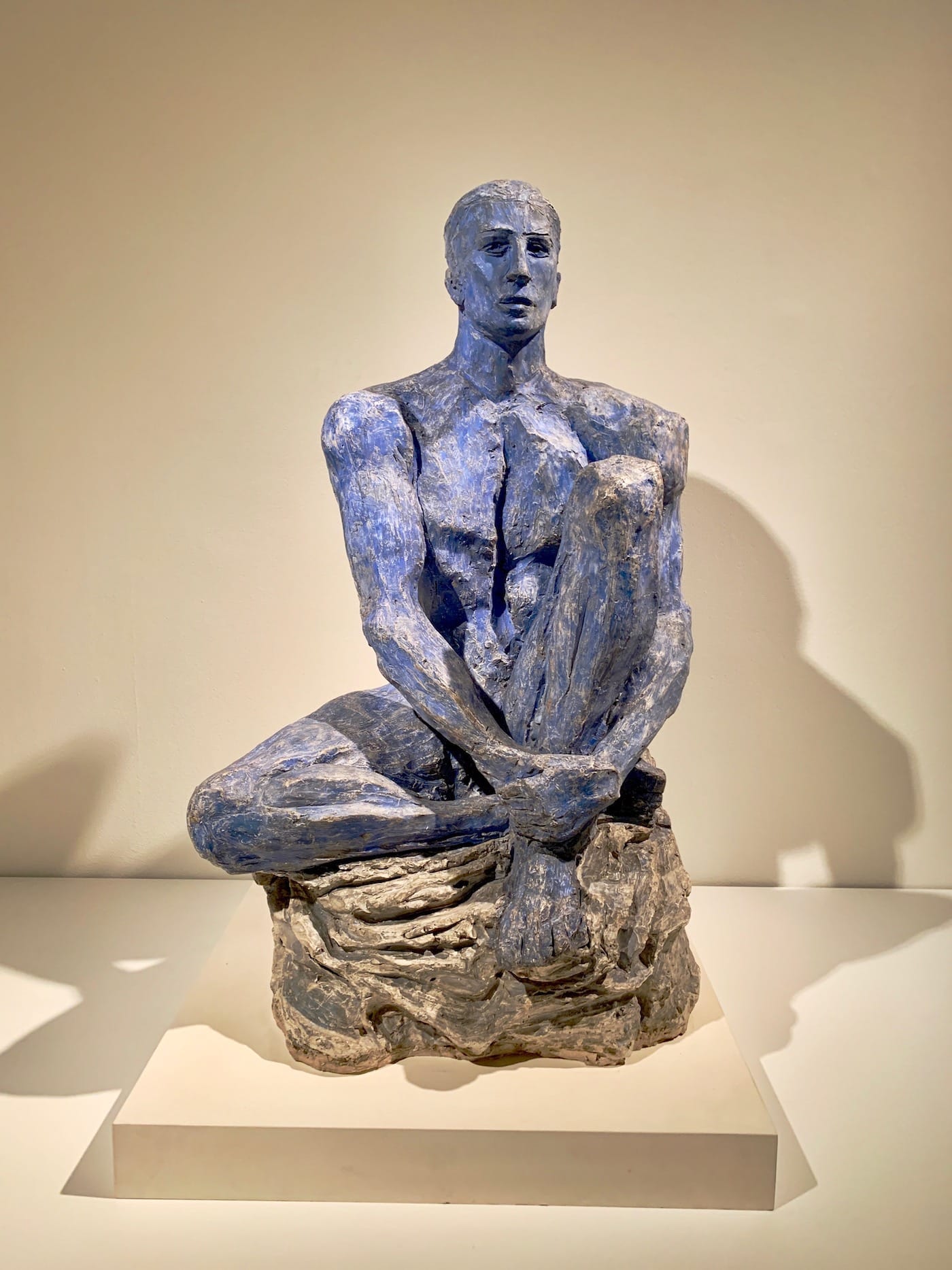 Throughout the exhibition, Candela does an excellent job of telegraphing developments in Fontana’s style before they occur. On the Threshold‘s first room hosts “Olympic Champion (Waiting Athlete)” (1932), a blue-painted plaster sculpture of a man whose sternum is punctured by a long vertical slash. A precursor to Fontana’s modernist signature, the slash in context represents casual violence. Compositionally, the cut succeeds as a way to center and balance a sculpture whose subject is the male athlete’s perfected body; however, it also deals a deathblow to the figure, rifling deep within his chest cavity.