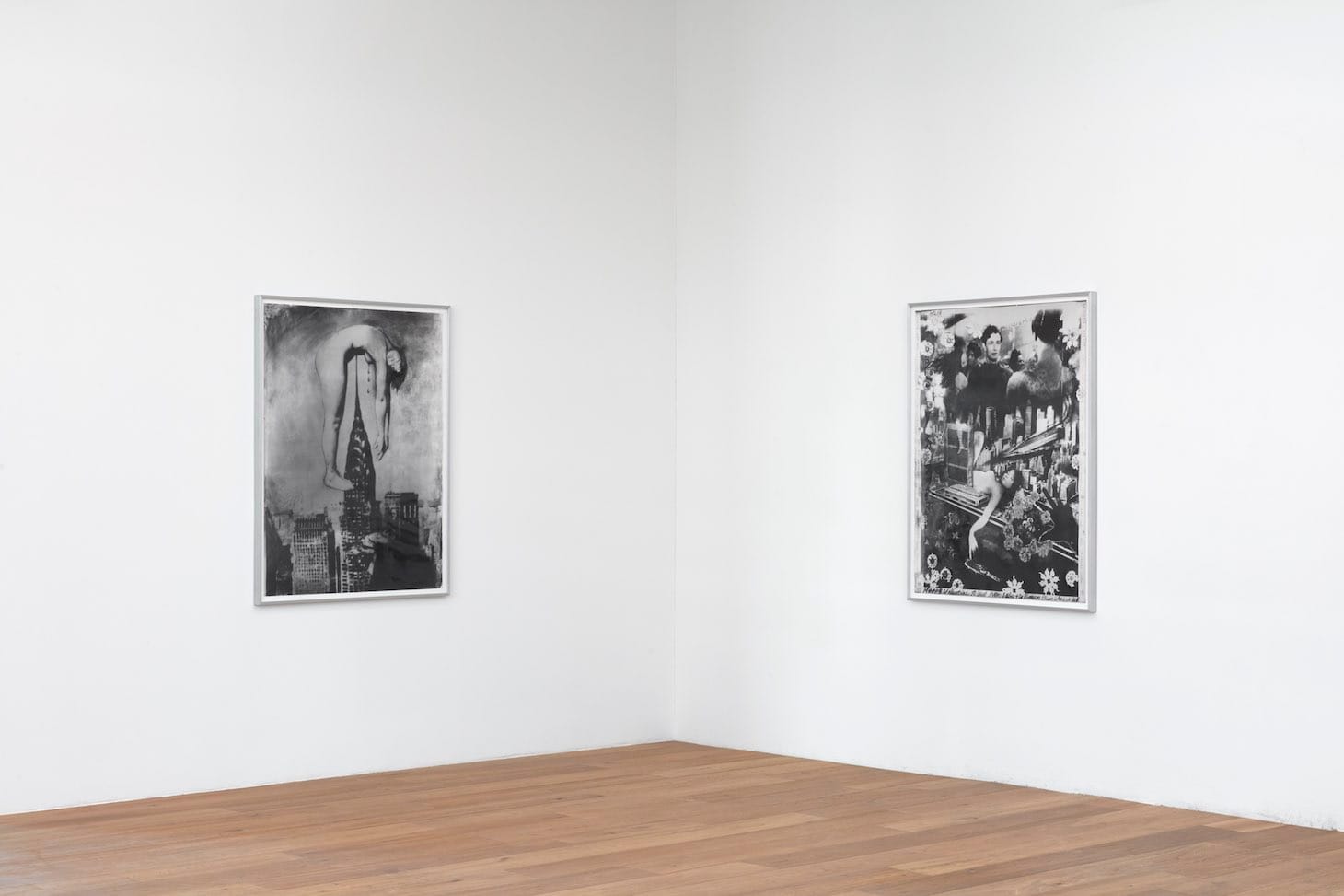 With her Giant Women on New York photomontage series (1969–74), Steckel inserts her own image in New York City’s skyline. In “My Town,” a sultry Steckel lies nude across the city, its towers passing through her transparent body. “Pierced” is more blunt in its depiction of the phallic skyscraper’s abuse of the female body: the artist hangs limp above the Chrysler Building, impaled at the waist by its sharp crown.