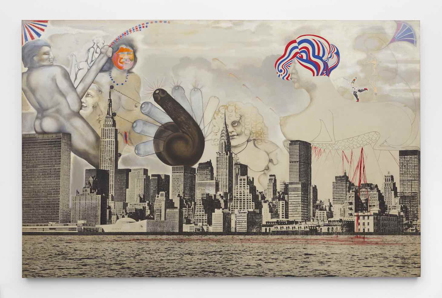 The show’s centerpieces are two works from her New York Skylines series. Giant oil-painted men and women lounge atop a screen print of New York City in the 64-by-99-inch “N.Y. Canvas Series #2” (c. 1971). Its combination of decadence and horror looks back to German Weimar-era art, for instance Otto Dix’s triptych “Metropolis” (1927–28). In place of Dix’s cosmopolitan couples and mutilated war veterans in Berlin, Steckel’s nude revelers take over the sky above Manhattan like hulking gods. On the far left, a colossal man sits on an office building as a small woman presses against his massive erection.