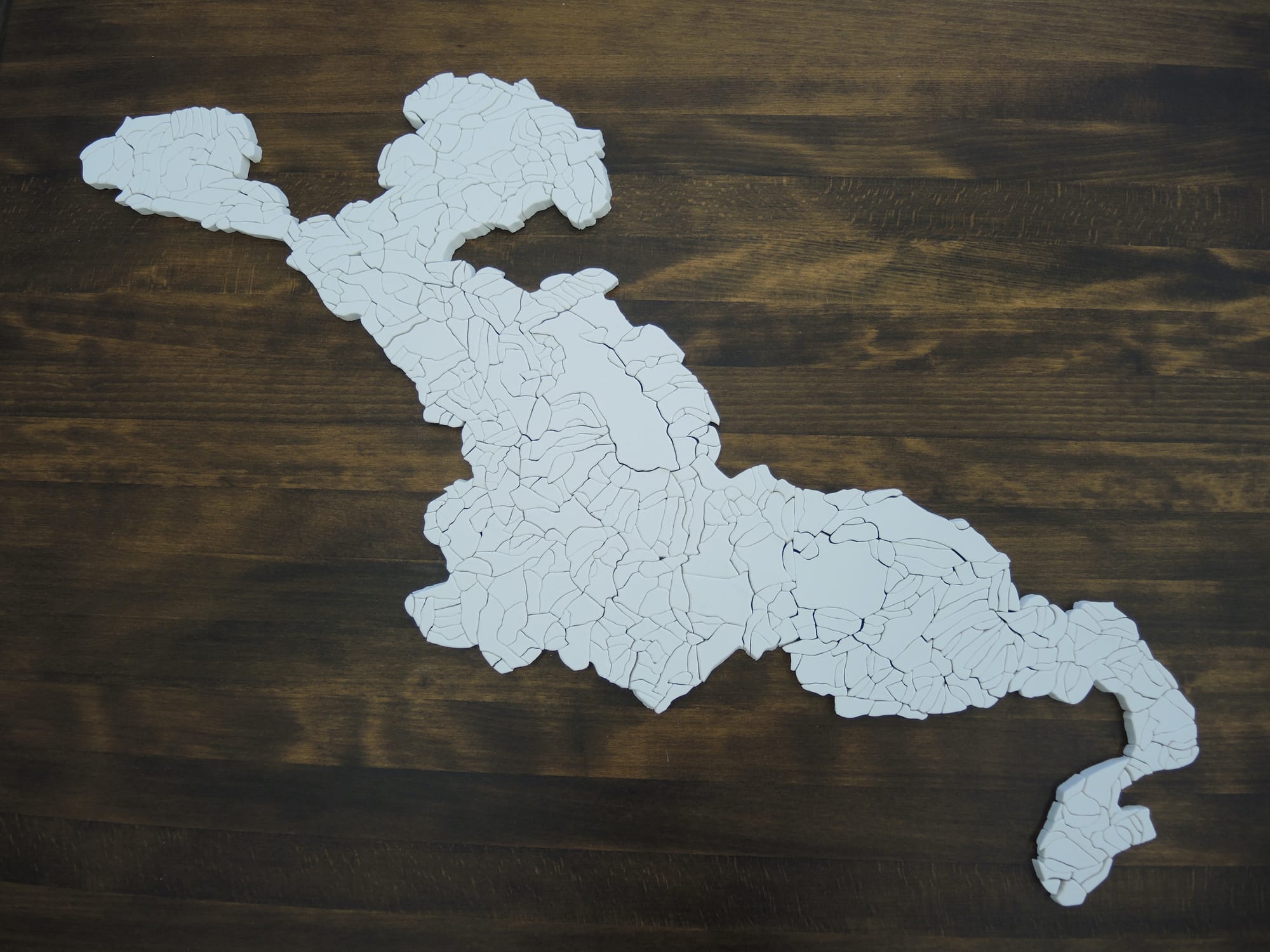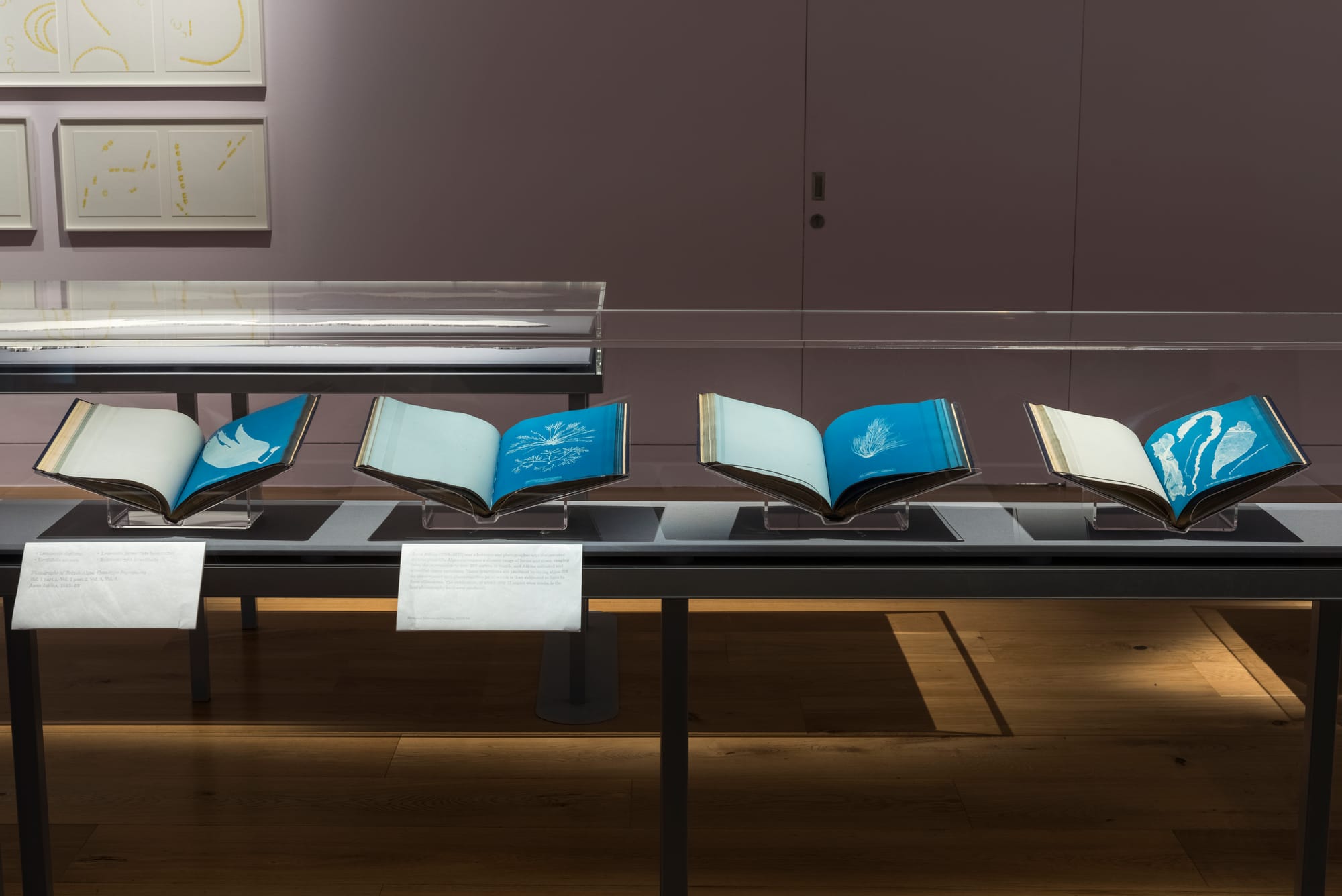 The first section addresses the air that is produced or stored in oceans and earthbound substances. Its representations of algae and seaweed include cyanotypes by 19th-century photography and botany pioneer Anna Atkins, as well as illustrations by naturalist and eugenicist Ernst Haeckel (a nearby wall text acknowledges Haeckel’s racist views). The space also features Irene Kopelman’s porcelain sculpture “Gornergletscher from On Top” (2017), which depicts a large mass of ice in the Alps that is shrinking due to climate breakdown. The air bubbles in historic sheets of ice like this one archive the history of respiration and atmospheric changes on earth; as the ice recedes, this vital data is lost at an increasingly rapid rate.