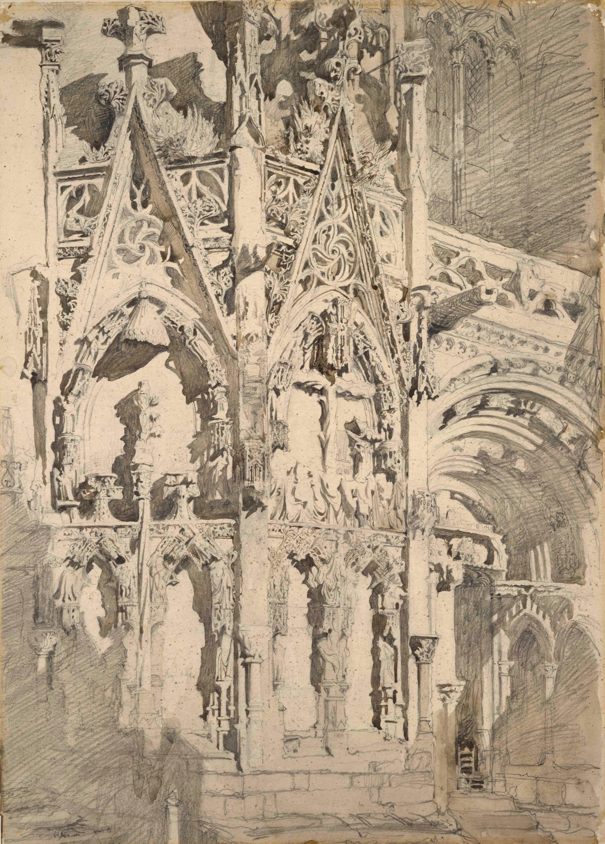 Ruskin was much more than an art critic and theorist, however, and this exhibition gives at least a taste of the various sides of this astonishingly polygonal figure. Ruskin was a fine draughtsman, of both architecture and nature, and a number of his drawings and watercolors are displayed. Of course, any piece of visual art is bound to be overshadowed by Turner’s “Venice, from the Porch of Madonna della Salute” (ca. 1835), on loan from the Metropolitan Museum, but to compare Ruskin’s sketches to the Turner canvas is a category error: Ruskin rarely aimed to create finished, complete artworks; for him, drawing was a way to discipline the eye, to truly see the complex and subtle harmonies of natural shapes and forms. It was also a way to record that which might otherwise might be lost, as in his painstaking drawings of Venetian architectural details, many of them from buildings scheduled for demolition or “restoration” (which, for Ruskin, was the equivalent of destruction, the wholesale erasure of the historical record).