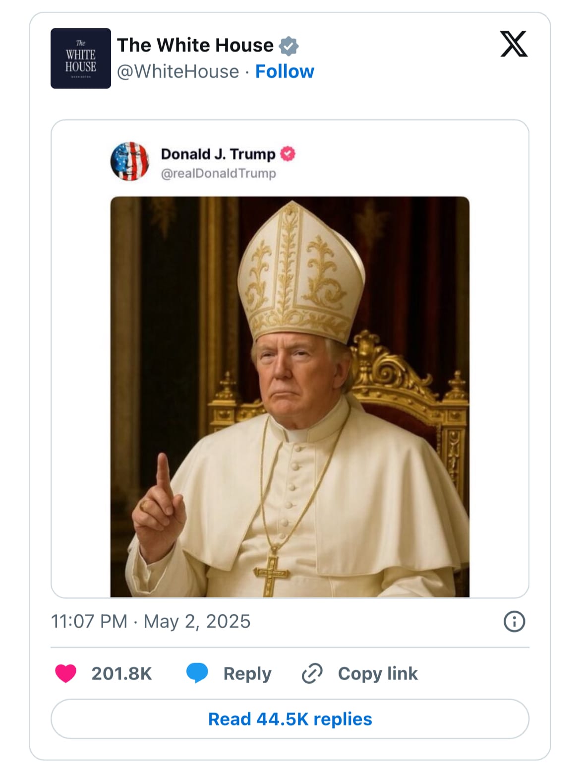 Others, such as X user Lepus, expressed that any world leader who posts a picture of himself as a religious leader shortly after his death is “neither funny, nor does it present statesmanship and respectful behavior.” The NYC Catholic Conference responded to the image on X, saying, “there is nothing clever or funny about this image, Mr. President. We just buried our beloved Pope Francis and the cardinals are about to enter a solemn conclave to elect a new successor of St. Peter. Do not mock us.”