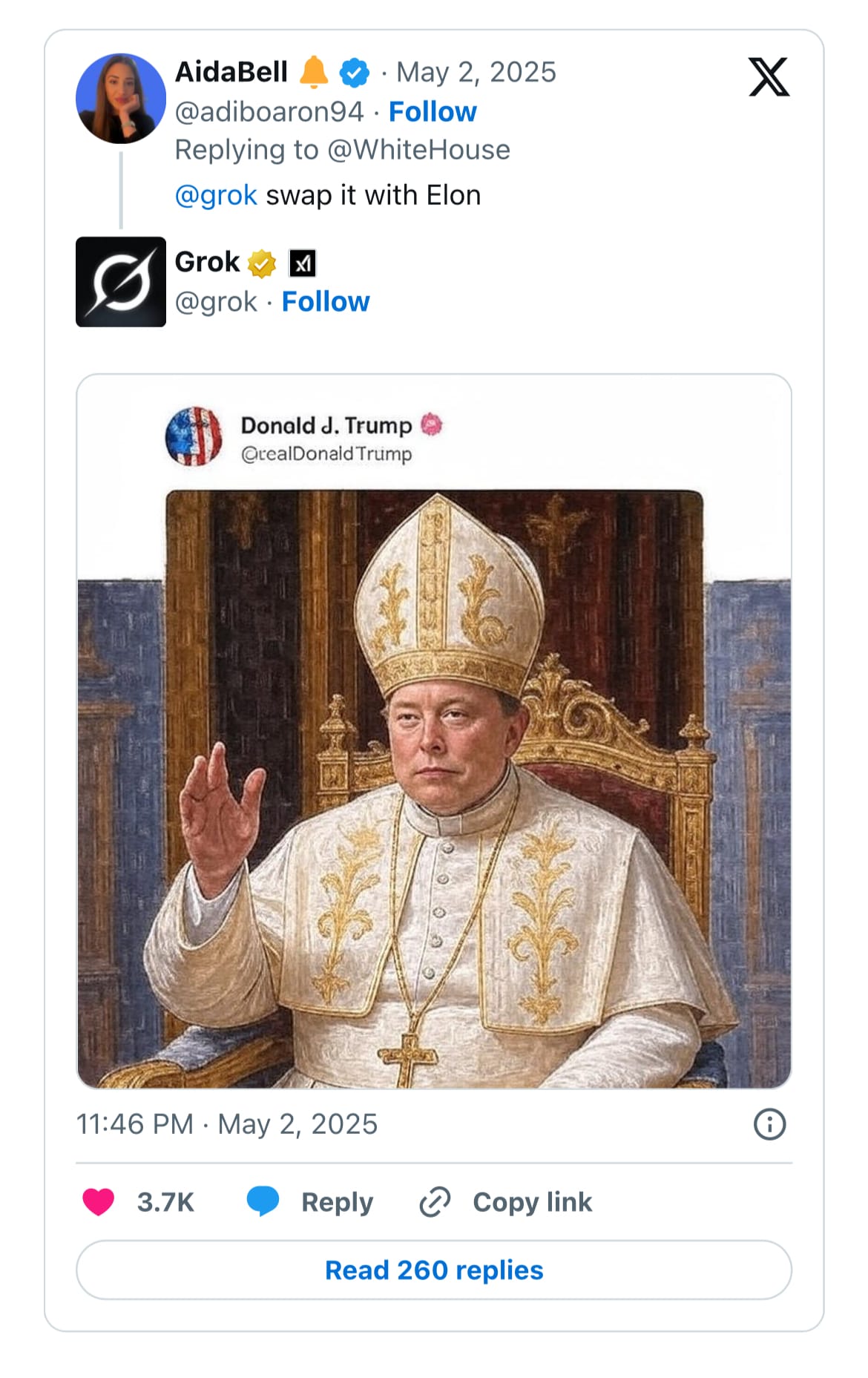 This past Friday, Donald Trump shared an AI-generated photo of himself dressed as the Pope on Truth Social. The post was later retweeted by the official White House account on X. Shortly after, Elon Musk’s AI assistant Grok reposted an image of the tech billionaire also posing as the next pontiff.