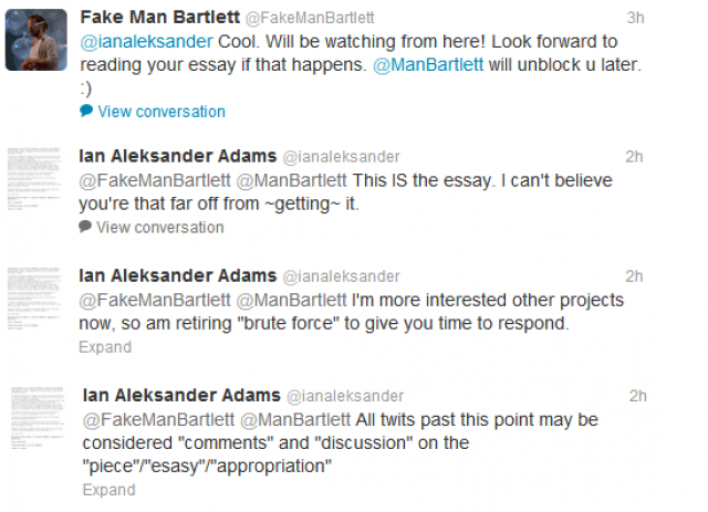 Artist Ian Aleksander Adams has turned his art practice largely into capturing hilarious and strange online interactions and posting them onto his Facebook and his Tumblr. Recently he rather vehemently critiqued a Twitter performance by Man Bartlett. The critique took the form of the documentation that arose from Adams’ engagement with Bartlett and others on Twitter, displayed solely as a very long screenshot (a section of which is pictured above).