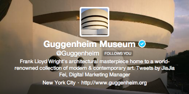 If Adams and the “Club Kids” are onto something, and I believe they are, could the role of those behind the social media for large institutions been seen in a different light? Could we call Todd Florio of Creative Time, Jiajia Fei of the Guggenheim (Twitter page pictured below), and Jennifer Yin of the Asian Art Museum the social media journalists for their respective organizations? They share news from the museum, engage in dialogue, write updates, and more; they are micro-journalists, constantly writing mini-articles that, taken over time, build into a great deal of content. Of course, some could argue that their use of social media is more akin to PR or advertising. If a journalist is employed by the institution they wish to cover, quality is compromised, not to say scope of the dialogue. Maybe in this respect, the anonymous Museum Nerd is one form of social media journalist we should be looking to, though many have critiqued Museum Nerd for being a constant cheerleader of all things museum.