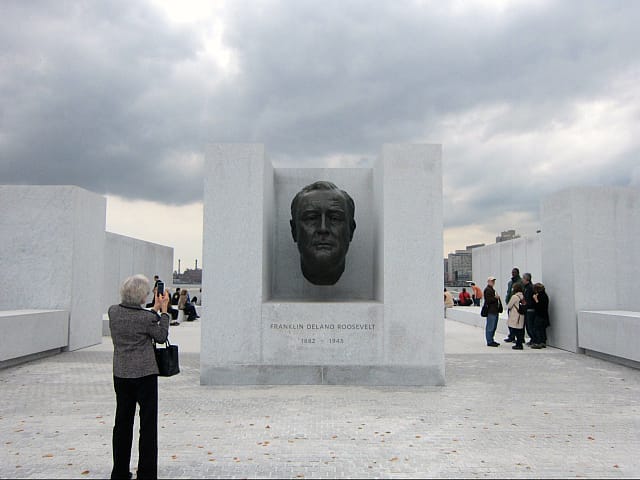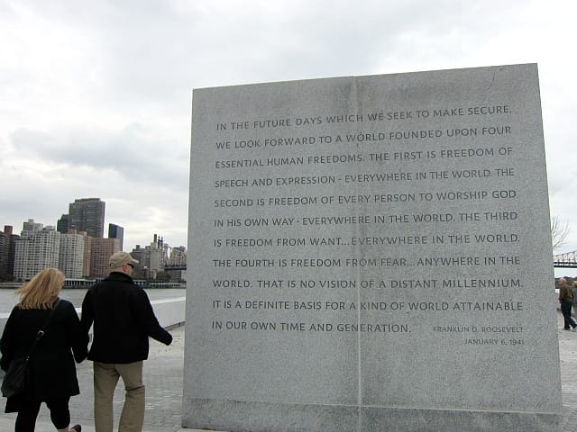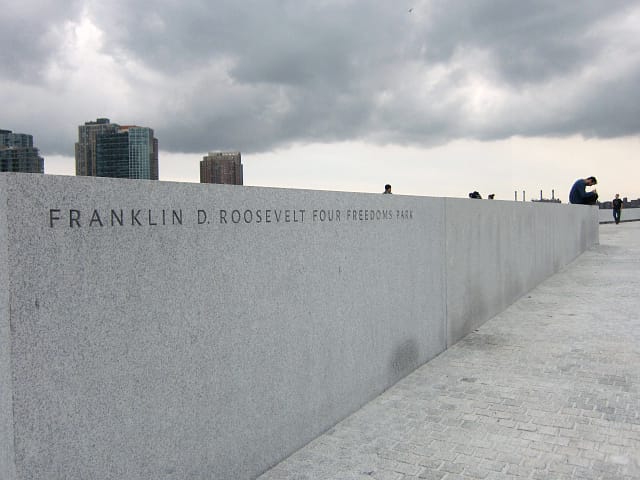 The “Four Freedoms” of the park is a reference to Roosevelt’s stirring 1941 speech, in which he looked to the future of “a world founded upon four essential human freedoms: ‘freedom of speech and expression,’ ‘freedom of every person to worship God in his own way,’ ‘freedom of want,’ and ‘freedom from fear.'” An extract of the speech laying out these freedoms is etched into the back of the granite enclosing the bronze head and is the only explanatory text in the park, which is otherwise free from anything didactic and leaves you to your own thoughts.