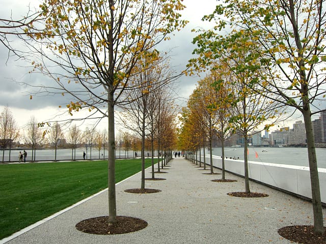The Four Freedoms Park also has a character that will change with the seasons. When I visited last Saturday, the memorial was dusted with the yellow leaves of the Linden trees that line its angled paths (and have hopefully survived the harsh winds of Sandy), while the dark clouds on the edge of the coming storm cast the lightly mottled granite in a dusty grey. Other times it will be sleeked by rain or illuminated by sunrises.