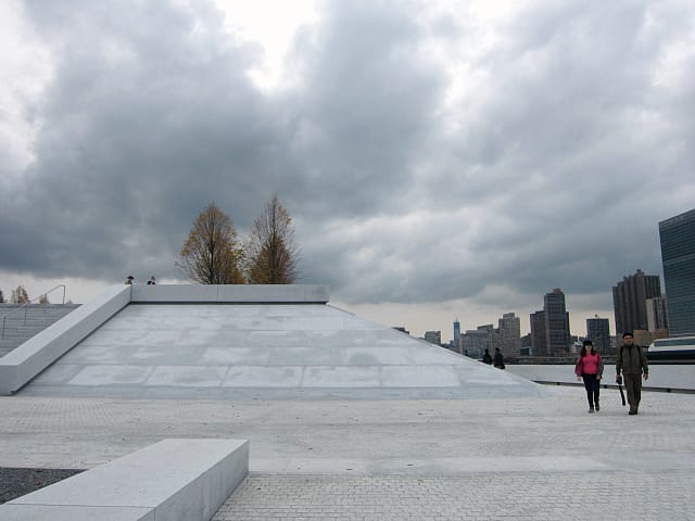 The park opened to the public last Thursday, and remarkably little has changed from Kahn’s original plan, which was his last design and only structure in New York City. In 1974, the architectural legend died anonymously of a heart attack in Penn Station, with drawings of the memorial said to have been found in the briefcase he was carrying, helping to identify his body. After his death, the park was dragged down with New York’s failing finances, and construction on the former landfill site only started on March 29, 2010.