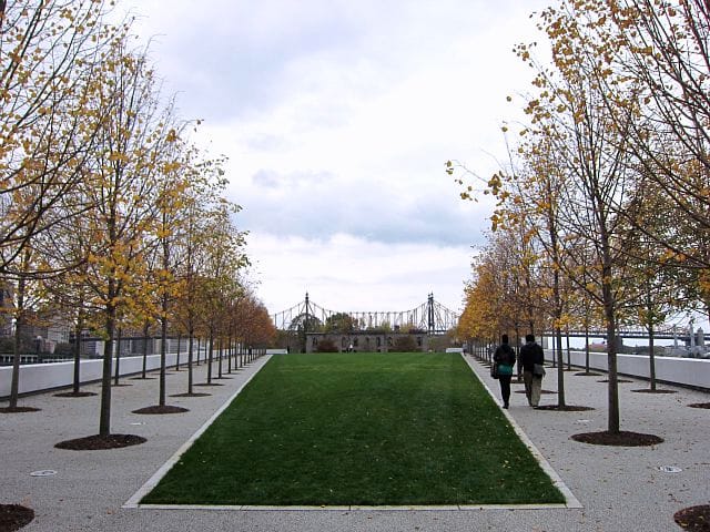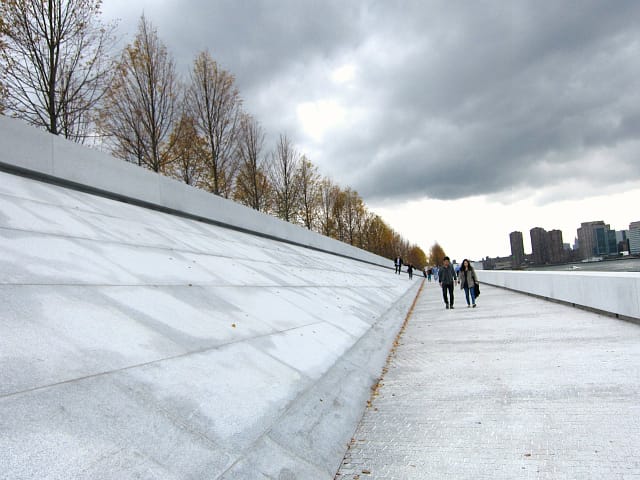 The subtle hues of the modernist park are perfect for the open sky at the end of the island in the East River, but the space isn’t entirely separated from the city around it, with the buildings of Queens and Manhattan rising on either side. Even the old 19th-century smallpox hospital at the island’s northern end is incorporated into the view, and someday that abandoned and ivy-laced James Renwick, Jr. building will become a visitor’s center. The park constantly asks that you think about the places around you, but from a position of meditative calm. Even the High Line, New York’s other park that places you in but above the busy city, doesn’t remove you from the chaos completely like this.