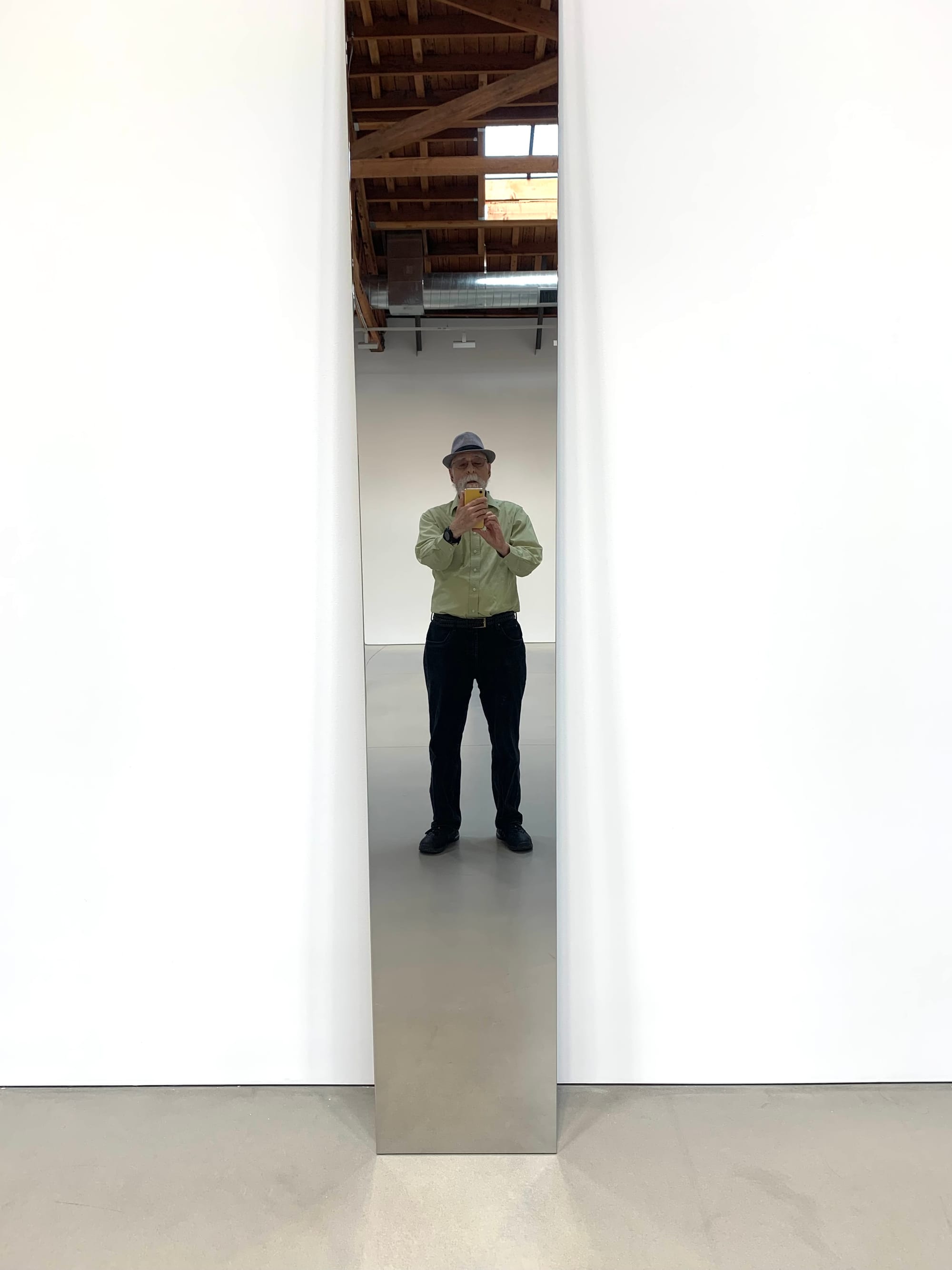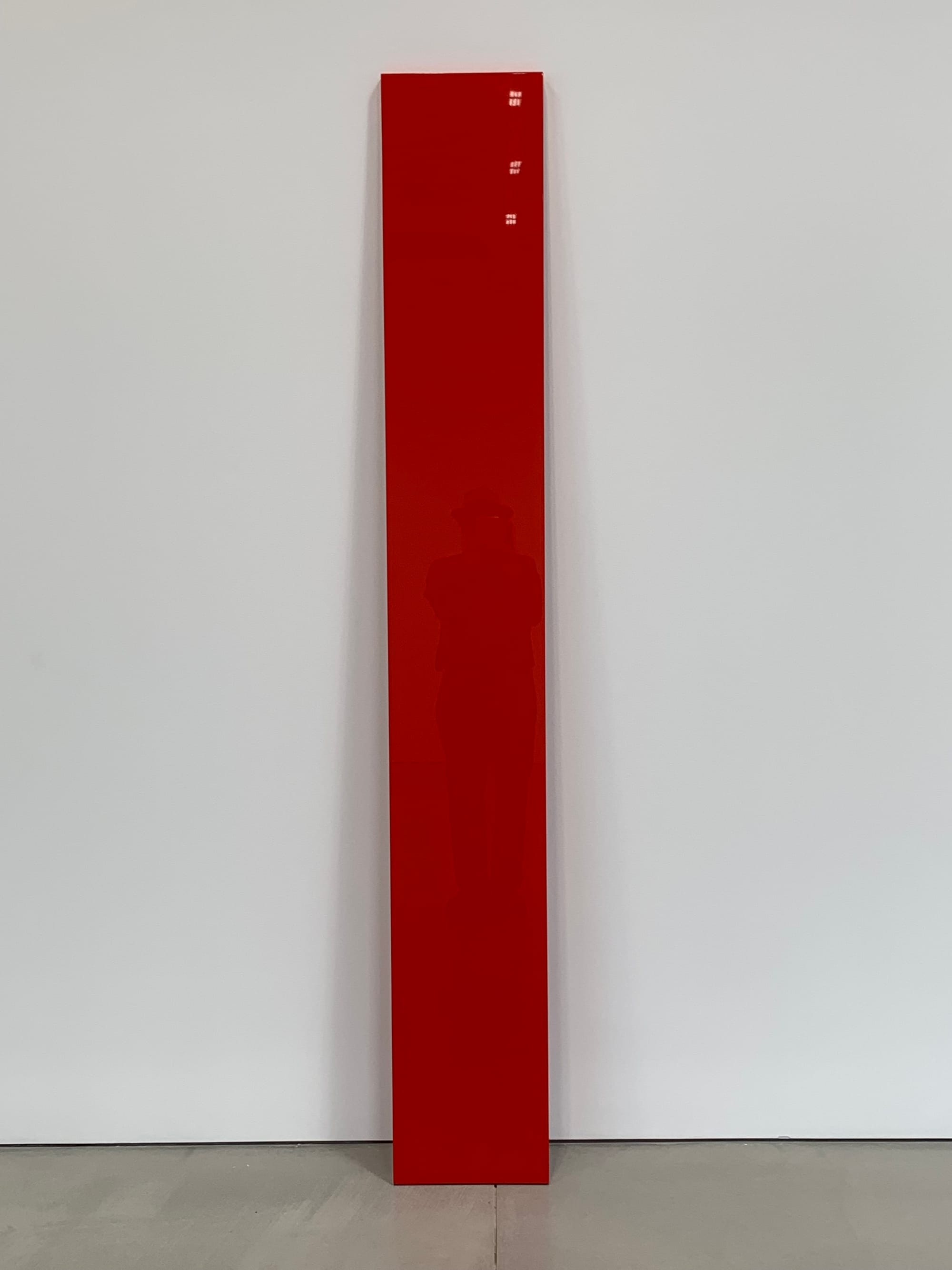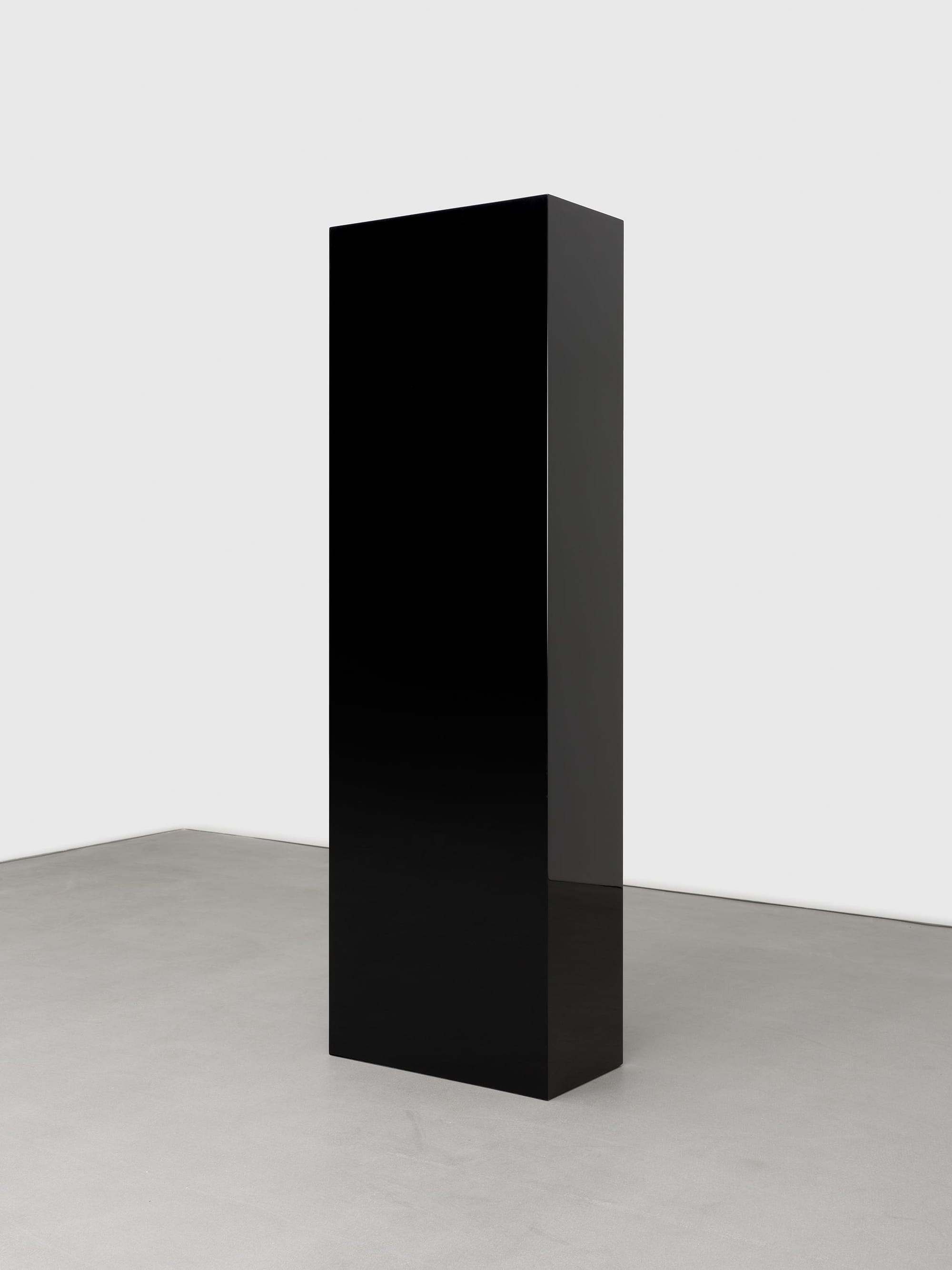 McCracken, indeed, admired Newman’s art. Standing before narrow plank works like “Untitled (Red Plank)” (1976), its reflective surface of hand-coated layers of pigmented resin framing my body, makes me feel as if I have entered a Newman zip in a moment of transcendence. Such empathic engagements can yield emotional states that vary in temperament, as the artist exploited pure saturated color in ways that recall the colorfield paintings of Ellsworth Kelly. Red, for example, may feel joyful or passionate, while black conveys a mysterious or ominous tone. One notable exception to the exhibition’s palette of lush red, deep black, marine blue, forest green, and smoky gray in pigmented resin is “Untitled” (2011), a stainless steel plank that functions as a mirror, recalling a Yayoi Kusama Infinity Room (1965–ongoing) in the way that it reproduces both ourselves and the surrounding space.