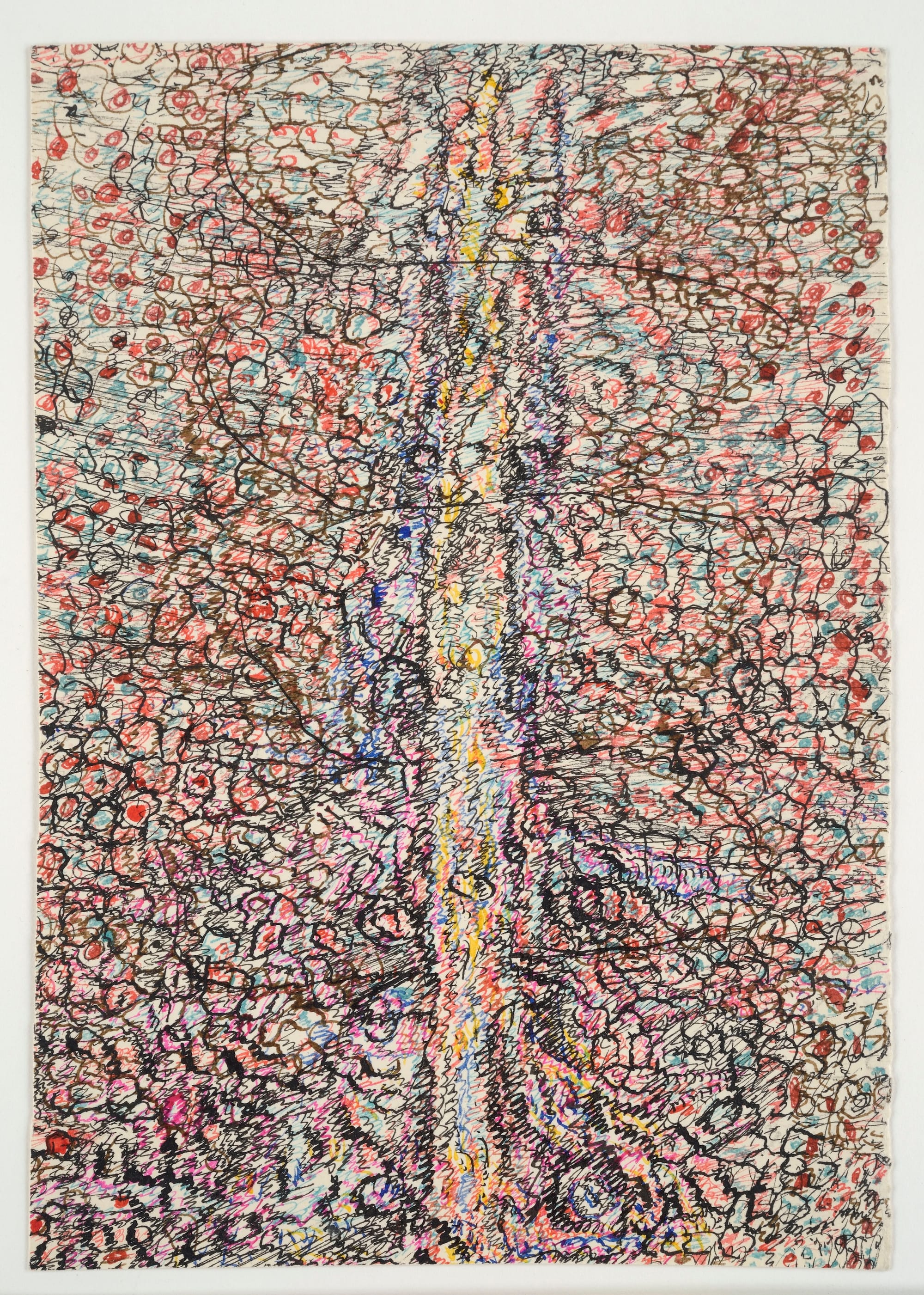 In the early 1960s, one aspect of that permission had much to do with the taking of the psychedelic mescaline, in very controlled circumstances, in order to discover what it might reveal about the nature of his own consciousness. Some time after having imbibed the stuff, and having also taken pains to drink a good deal of water, he made an entire series of drawings, relatively small ones for the most part. They are acts of mark-making of a particularly furious and intense kind.