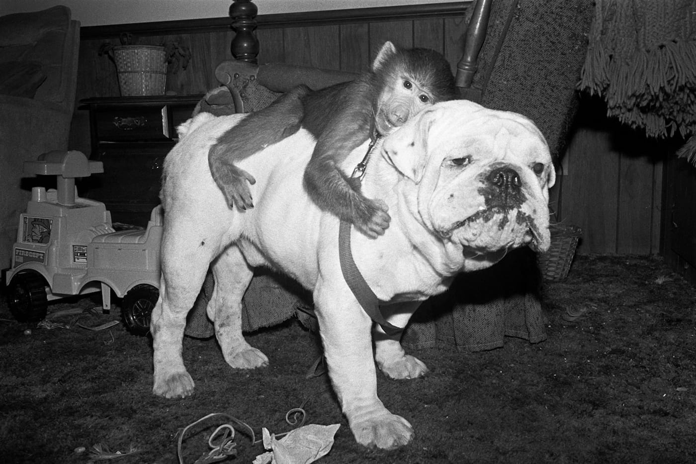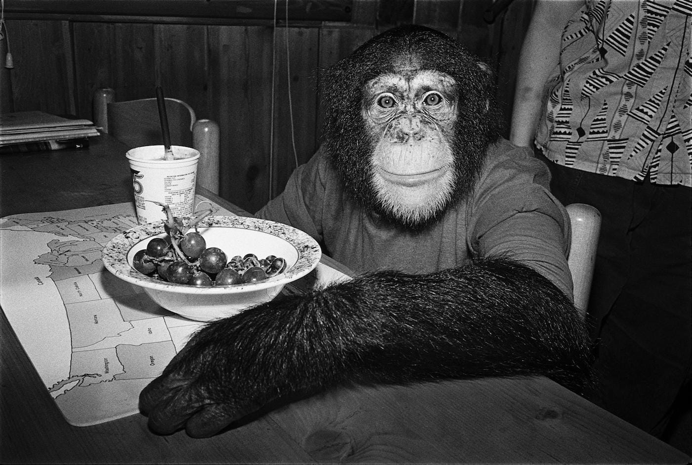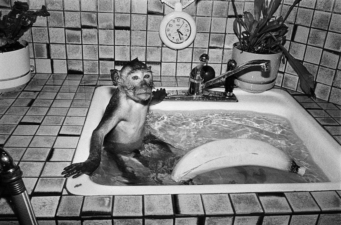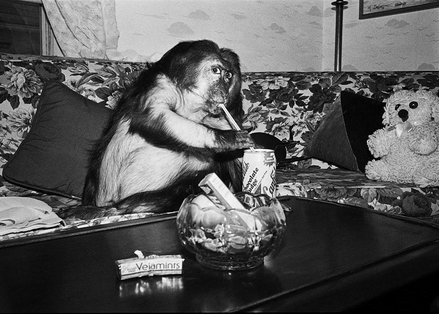 Over the course of her career, the photographer Robin Schwartz has documented Arabber stables in Baltimore, afflicted animals in America’s zoos, and pigs with free reign of the blue waters of the Bahamas. The series she’s spent the most time on, though, centers on the animal group most closely related to us and also transports us to the most quotidian of spaces. Like Us, photographed between 1987 and 1992, spotlights the lives of primates who reside in people’s private homes. As its title suggests, the project showcases, in stark black-and-white scenes, monkeys hanging out just as we might: lounging on couches, cuddling with our cats and dogs, or even enjoying a can of Canfield’s Diet Chocolate Fudge soda, sipped through a bendy straw.