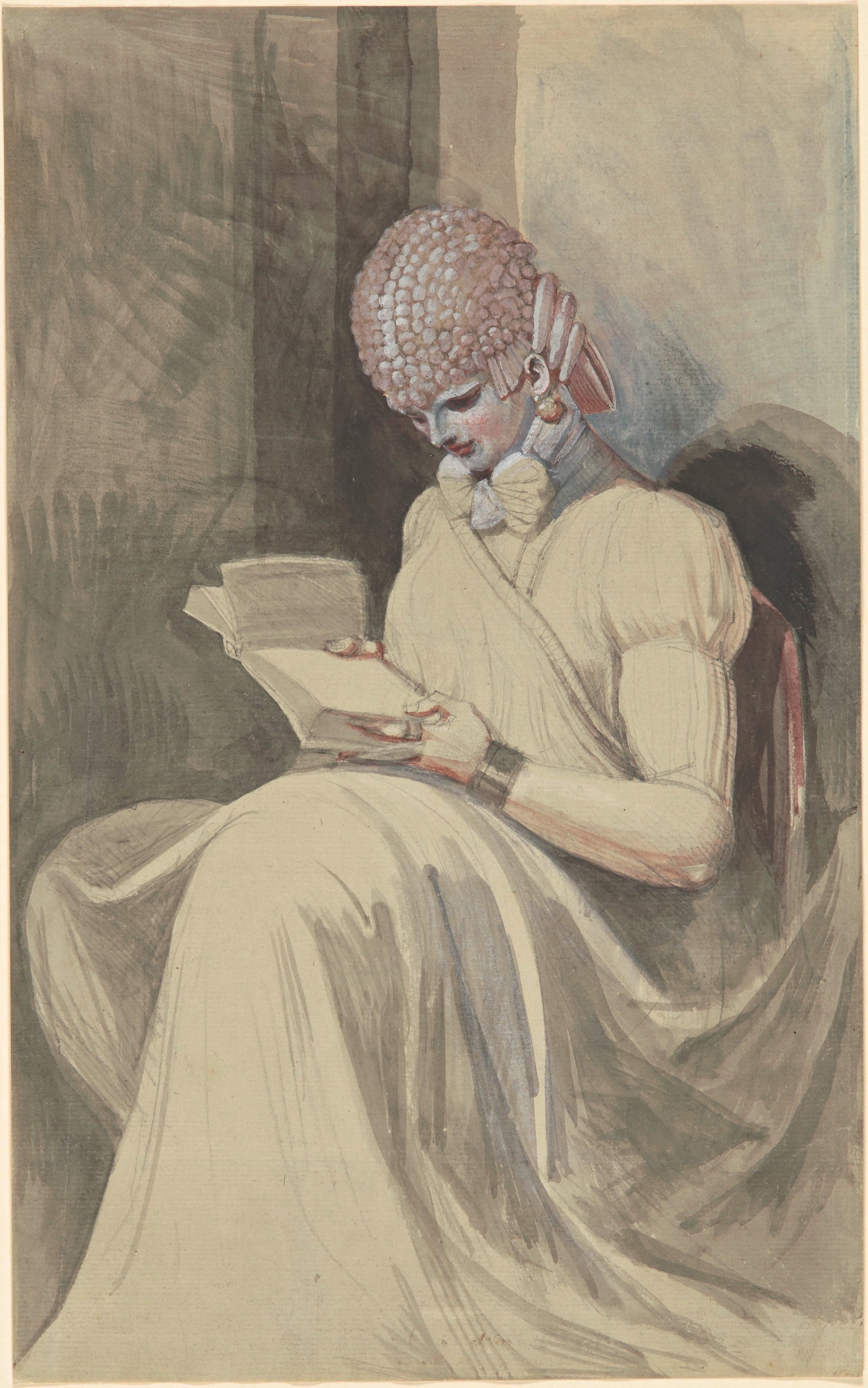 A typical example may be found in the opening section focusing on Fuseli’s fascination with excessively complicated, restrictive hairstyles, mostly in portraits of his wife, that “[discipline] the hair’s potential wildness,” rendered with extraordinary detail and attention — part of the “Fetishism” of the show’s title. In “Seated Woman (Sophia Fuseli?) in Curls, Reading” (c. 1796), the caption advances: “In a patriarchal society, dressing their hair offered many women an opportunity for self-expression. Fuseli’s response stages his own fetishistic obsession in tandem with a socially-driven impulse to reassert masculine control over female sexuality.” As suggested in captions elsewhere, Sophia was instrumental in designing the elaborate, highly idiosyncratic head ware and actively engaged in a kind of dress-up that Fuseli was drawn to in his obsessive detailing of her constructions. It indicates an equanimity between the sexes, an intimate and private exchange between the couple, more than an example of a patriarchal society’s desire to oppress women.
