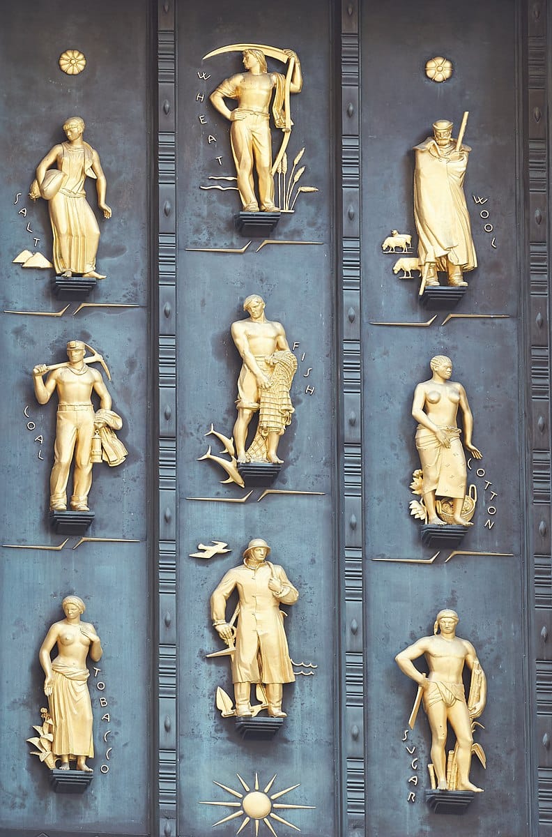 Jennewein didn’t design the other part of the entrance artwork: the grille with gilded sculptures between the two columns. That was the work of Thomas Hudson Jones, who depicted famous American literary figures and characters including Moby Dick, Walt Whitman, Tom Sawyer, the Raven from Edgar Allen Poe’s poem, and Natty Bumppo from James Fenimore Cooper’s Leatherstocking Tales series (1827–1841). All the authors are White, and all but one, the author of Little Women (1868) Louisa May Alcott, are men.