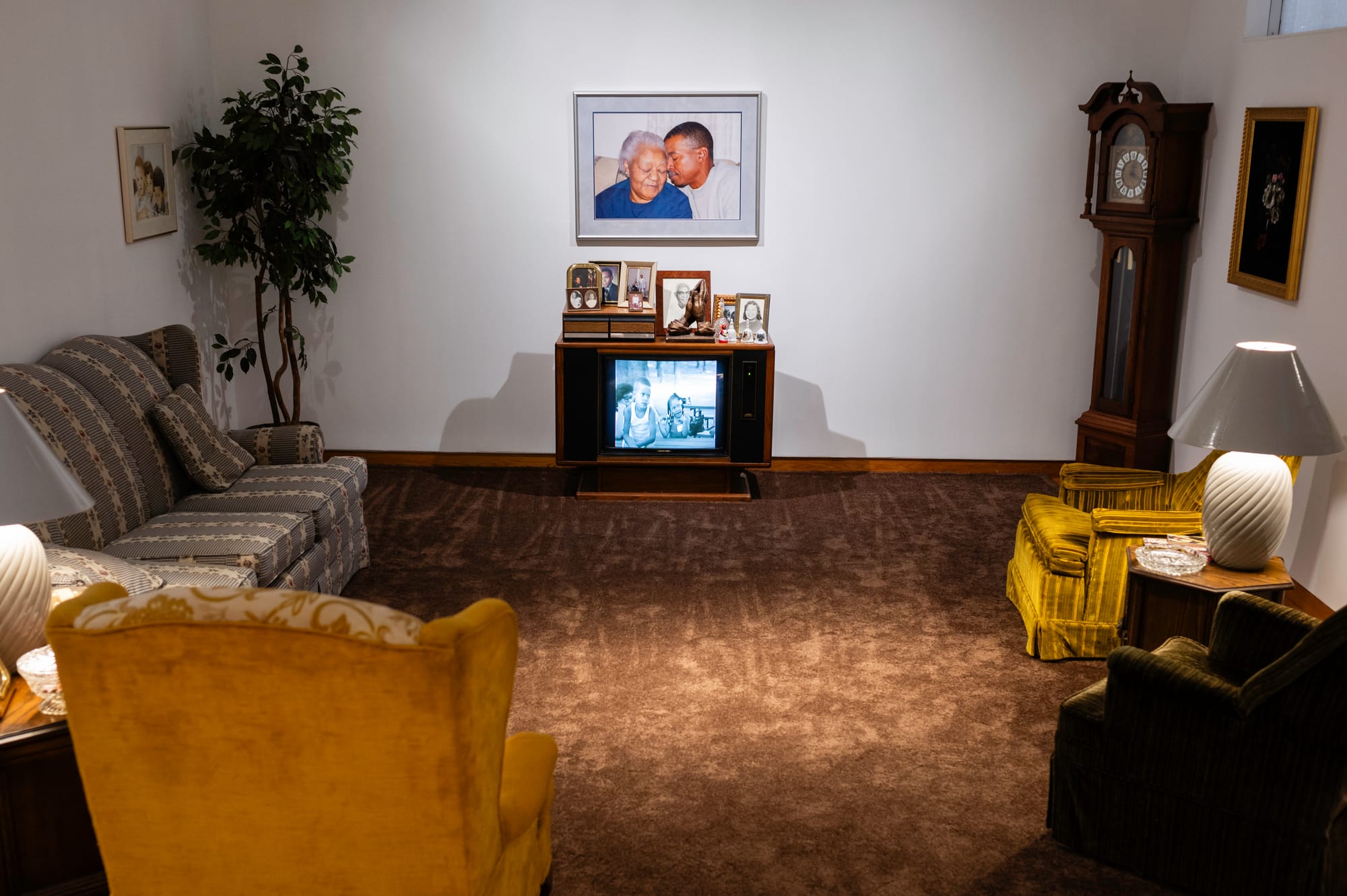 At times the grief is almost too much to bear. Across the five or so galleries, the exhibition touches on themes like addiction, police brutality, lynchings, absentee parents, loss of family, labor inequities, and misogynoir, wringing out every ounce of feeling. A neon noose hangs from the ceiling in one corner, gleaming almost acidically. The painting “Kin to War” (c. 2023) depicts a doe-eyed Brown boy fastening on a military-grade helmet, a reminder that daily survival for Black people can feel like fighting in a war we are conscripted into from birth. Later, Moore takes us into his late grandmother's sitting room in an ambitious installation cut directly from memory. With its plush brown carpet, family photos, and chintzy framed pictures of flowers, this could be the living room of any Black grandmother. The artist invites you to interact with the space: come in, sit down, and take a peppermint. Most poignantly, pick up the landline phone and you'll hear audio of Moore’s late grandfather.