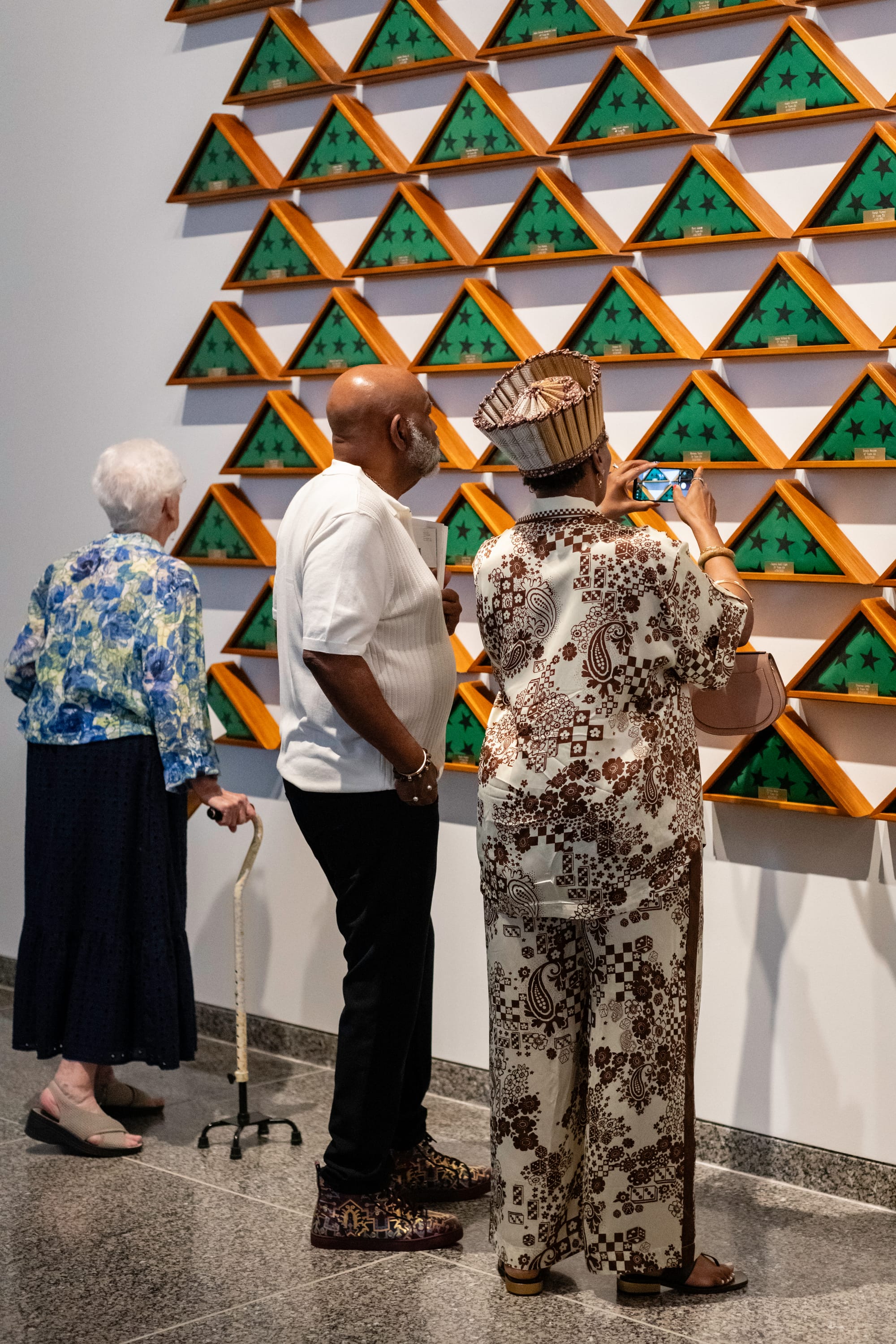 True to its title, the specter of Death hovers over the exhibition. In the first gallery, four black and white oval paintings hang like memorial portraits, evoking the 16th Street Baptist Church bombing that killed four little Black girls. In the main gallery, 34 black granite tombstones stand regally, like soldiers, making up the stunning centerpiece of the exhibition. The headstones are blank, except for one, which reads: “Involuntary Veteran of The United States of America, Husband Father Son Brother and Friend, In Loving Memory.” Mounted on the wall behind them is “Every N*gga a Star” (c. 2023) — a somber constellation of framed folded flags that recall those that typically commemorate fallen soldiers. Instead of the traditional stars and bars, however, Moore uses the red, black, and green African American flag, and the names engraved on the plaques are those of murdered Black Americans. Trayvon Martin, George Floyd, Breonna Taylor, Emmett Till, Eric Garner — the names go on and on. Walking into that gallery feels like attending a funeral.