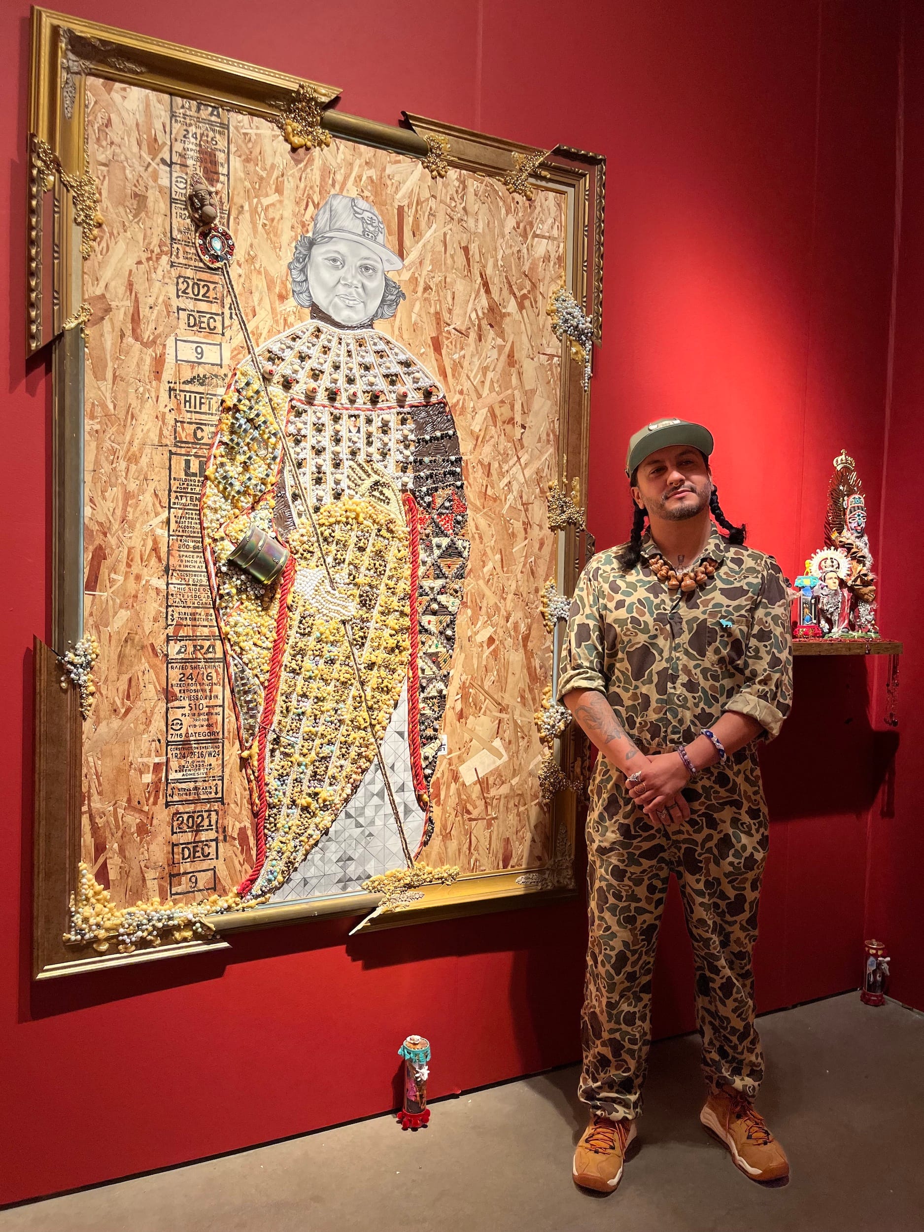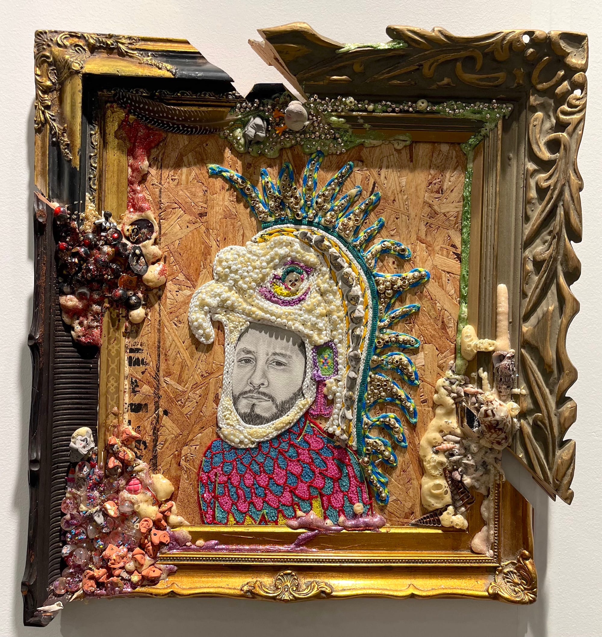At the booth for New York’s LatchKey Gallery, Luis A. Sahagun stood near his portraits of his family members. Crafted from particle board, broken frames, beads, seeds, rope, drywall, and found materials, the works resemble Byzantine altar panels depicting saints. The faces, sketched in graphite, appear out of place in the ornamented panels, suggesting the ill-fitting forms of history imposed on non-European populations. Sahagun, originally from Guadalajara, Mexico, earned his MFA at Northern Illinois University. He said he seeks to reframe the way undocumented individuals are viewed. He not only ensconces the value and strength of each subject within the portraits, but also offers a kind of “spiritual cleansing” that draws on symbols from pre-Columbian mythologies. Having worked in construction for a decade, he employs materials that reflect the labor of migrants.