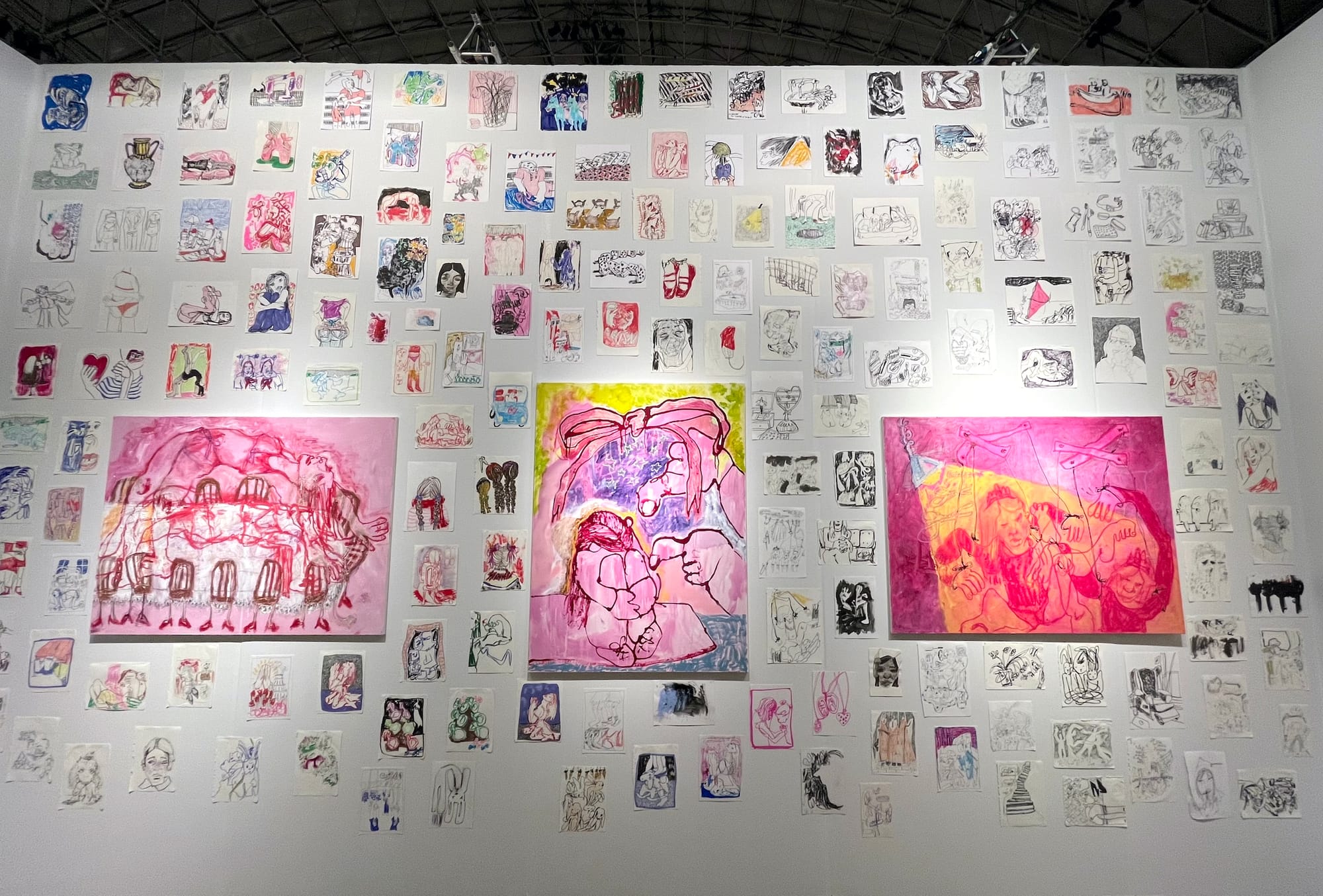 Dylan Rose Rheingold’s drawings and paintings at Miami Beach’s Jupiter Gallery were among Expo’s most exciting installations. Hundreds of pages from her sketchbook surrounded three paintings on canvas, as if engaged in a dance. Ideas, quickly noted in drawings, seemed to fertilize the air with promise, while their translation into larger paintings offered insight into the endless sifting, sorting, and selection of an artist developing work.