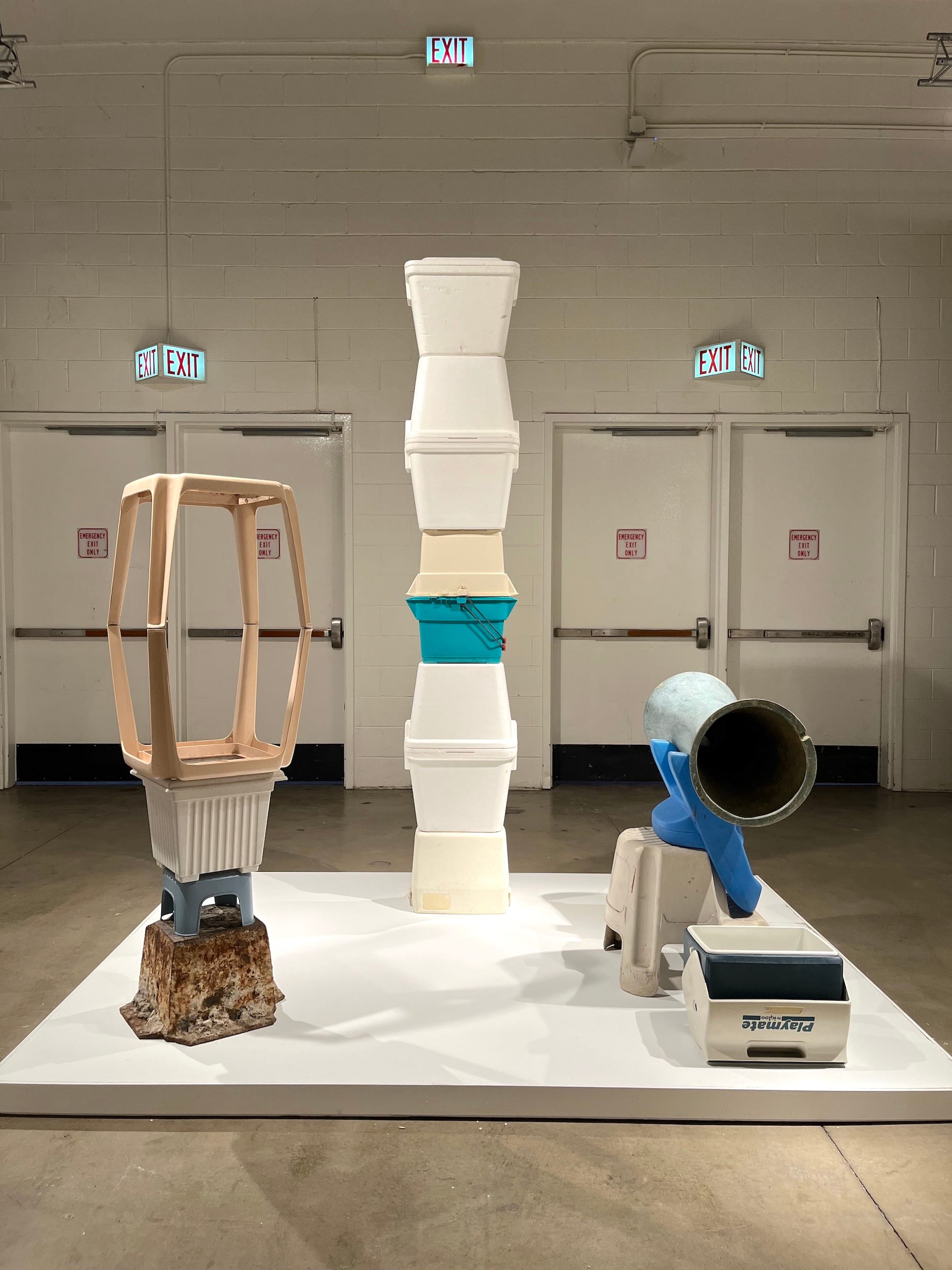 One of the fair’s curated or site-specific projects, by Cleveland artist Lauren Yeager, reimagines the form of modernist sculpture, a la Brancusi, with 21st-century domestic plastic products. Yeager stacks foam ice coolers or plastic end tables in simple compositions. While commenting on non-biodegradable waste, her seemingly authentic love of modernist sculpture endows what could easily read as pastiche with formal dignity.