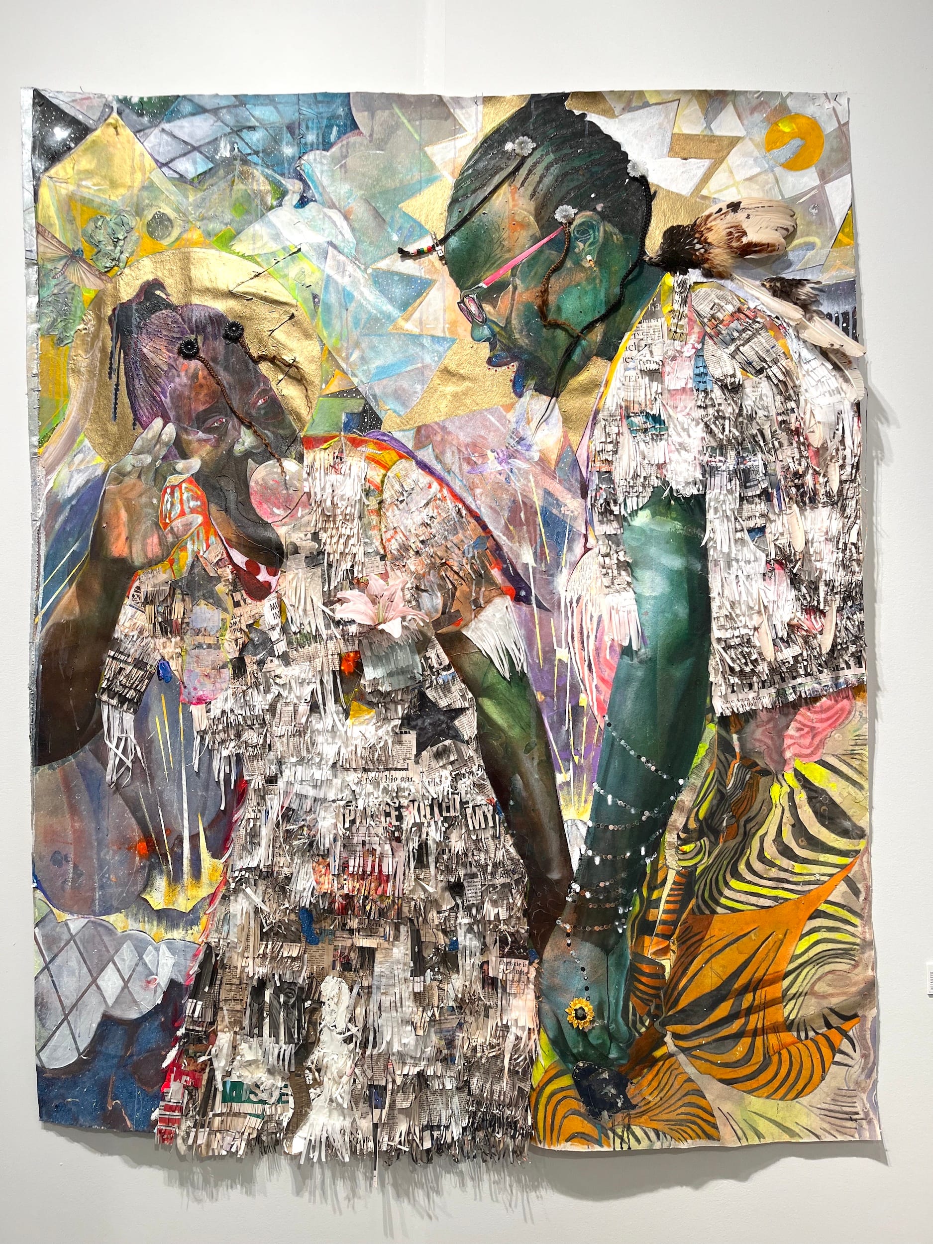 One of my favorite Chicago galleries, Monique Meloche, presented a varied program. Bahamian-American artist Lavar Munroe’s compositions incorporated shredded newspaper to make shaggy surfaces mixed with glitter, beads, spray paint, a hair braid, a shoelace, staples, thumbtacks, silk flowers, and a plastic insect. This mess of materials somehow distilled into a poised image of a man and woman in conversation, holding hands. This Herculean feat of hybridity sent chills up my spine: Munroe can clearly cobble a masterpiece out of almost anything. His creative process mirrors the improvisational ingenuity of survival tactics.