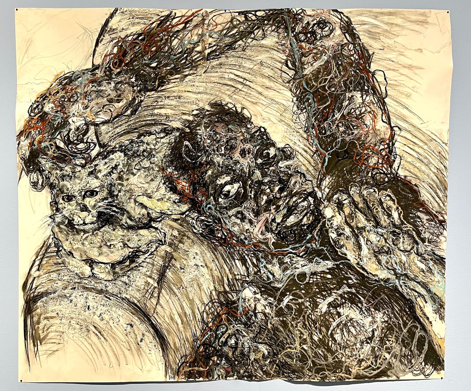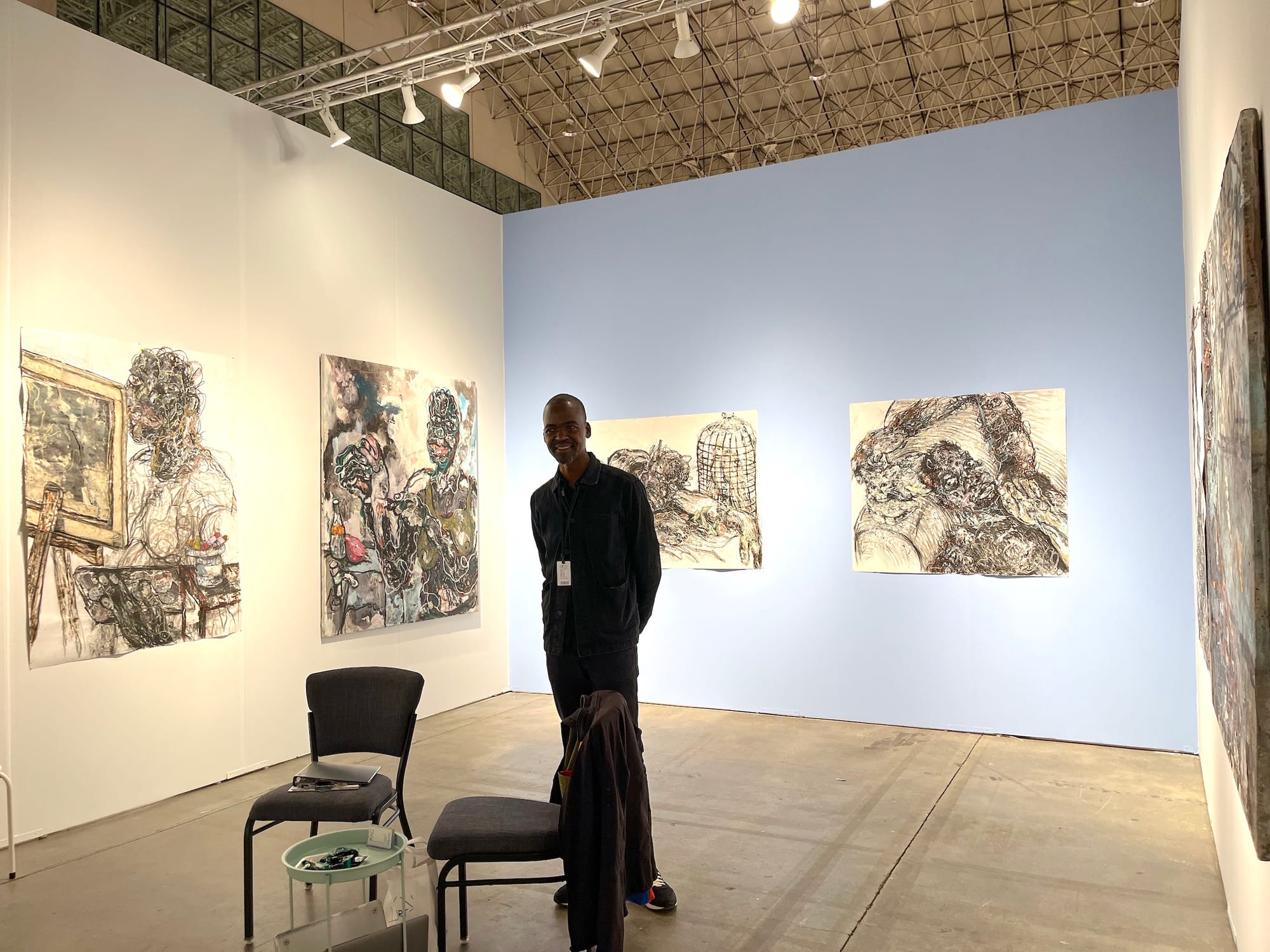 In a similar fury, the self-taught Ugandan artist Emmie Nume’s charcoal, pastel, and mixed media drawings, presented by Afriart, feel like tumbleweeds. The 25-year-old artist’s line is radial, threadlike, wild, as if his hand can’t move quickly enough to exhume the figurative images. These works are tangled skeins drawn with brushes and sticks. Nume, who made his first drawing in 2021, has already had a residency at Afriart, and currently holds a Tracey Emin residency in England.