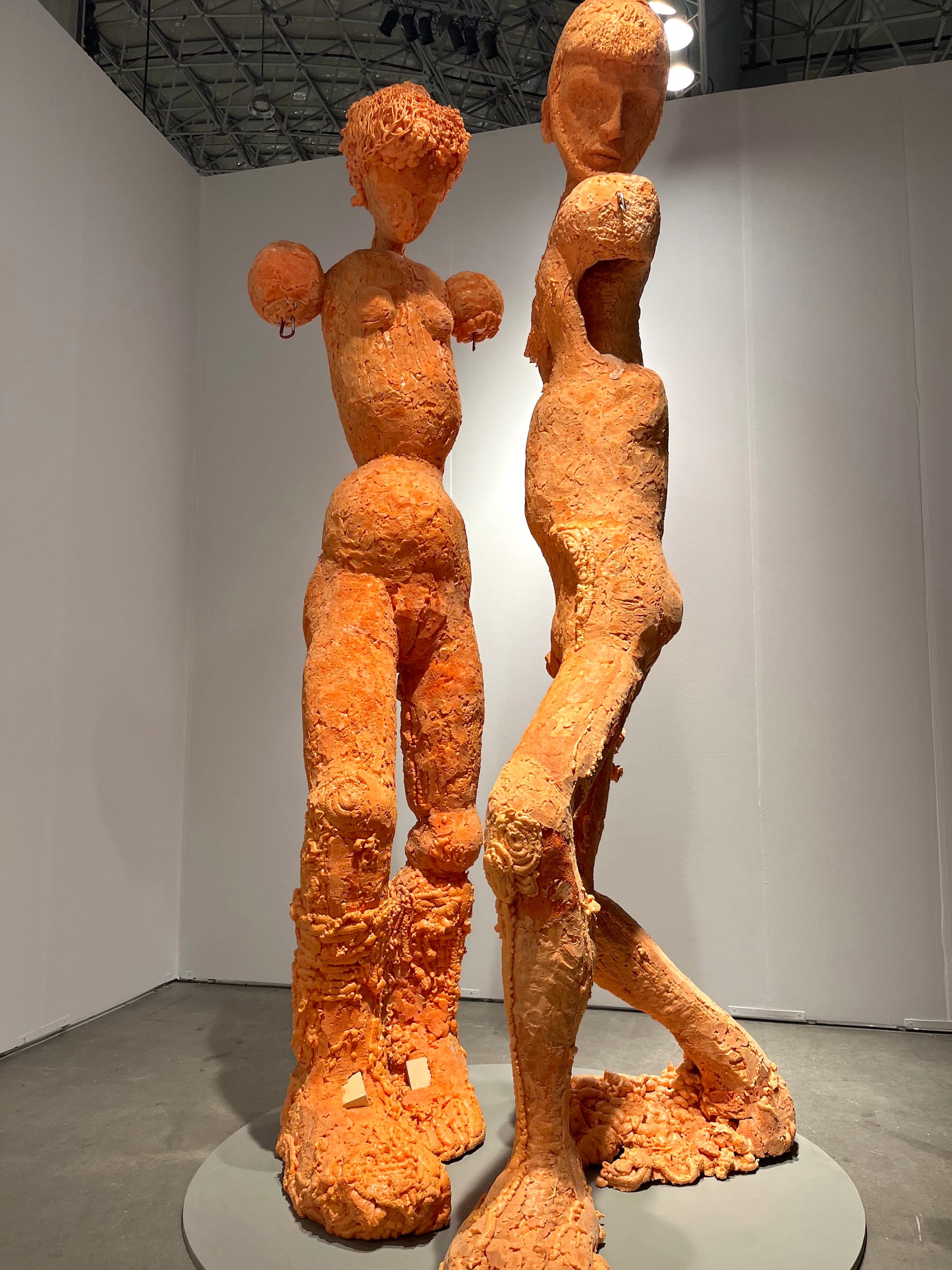 Lording over one aisle of the fair was Israeli-American artist Ohad Meromi’s giant sculpture “Expulsion” (2018–24) at New York’s 56 Henry gallery. Adam and Eve teeter in twisty contrapposto. Their lumpy polyurethane foam bodies tower 10 feet tall. Even with heads bowed, they project a prideful presence. The idea of expulsion, especially at this monumental scale, resonates with the trauma of the current wars in Gaza and Ukraine.