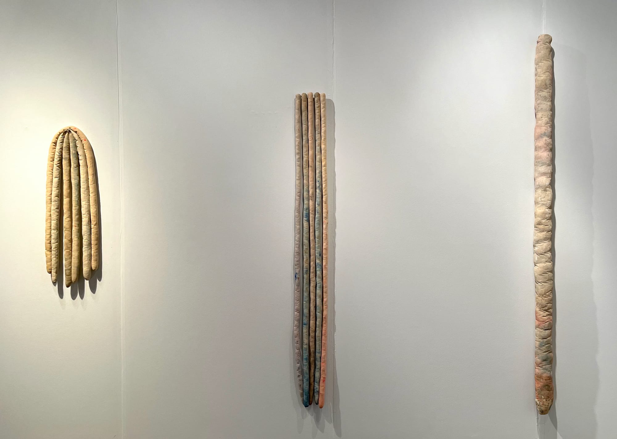Shirley Pettibone’s limp, tubular fabric sculptures at Duane Thomas fall into the “rescued from the compost” category. Pettibone, who passed away in 2011 and has been overshadowed by her artist husband, Richard, made this series in the 1970s, before turning to realist painting. Championed by Lucy Lippard in feminist art circles, the three draping forms on view were stitched and stuffed from paint-stained drop cloths. Their presence speaks of the body and the fight by women artists to infuse formalism with human vulnerability.