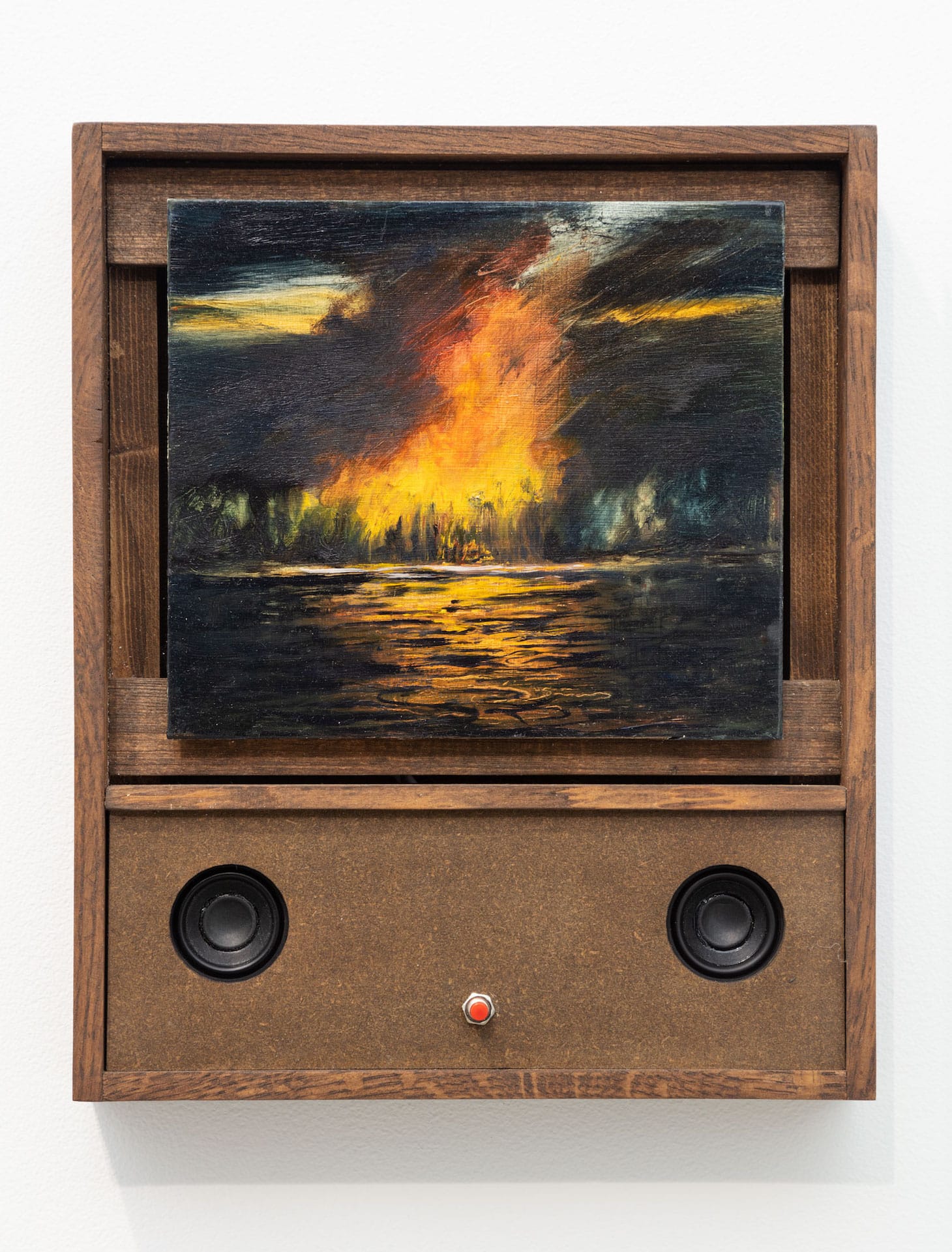 Each press of the red button shifts the soundtrack, for instance, Cardiff in a bath (in contrast to the painting’s raging fire and light-streaked water) or discussing “little snippets of lost dreams,” including one with a fire “creeping towards me.” Sound and images, stories and scenes combine.