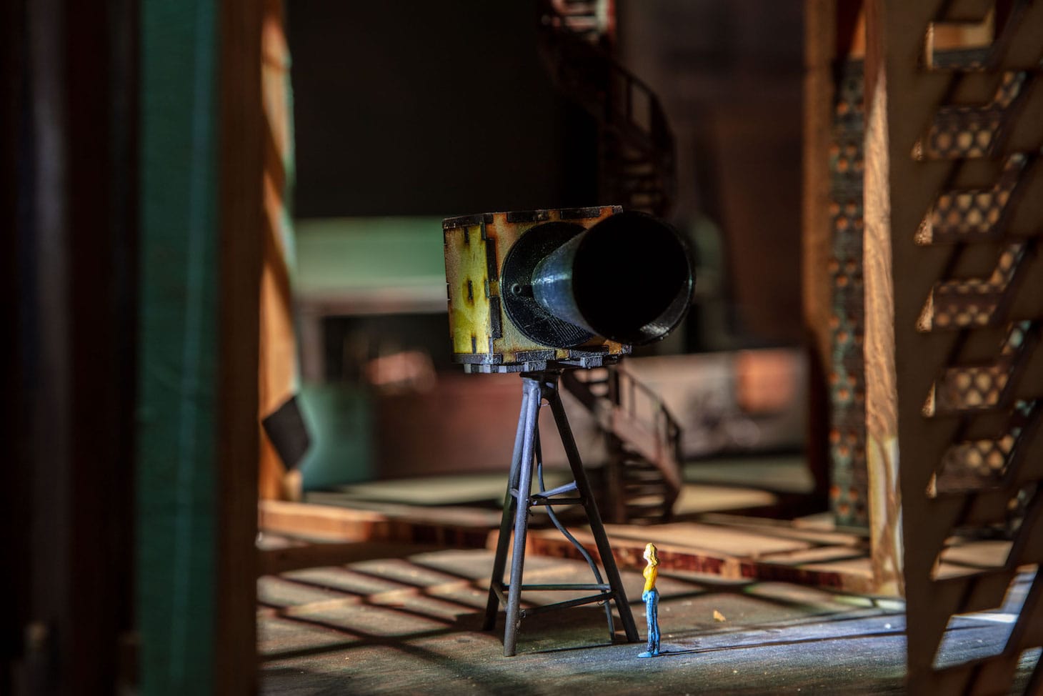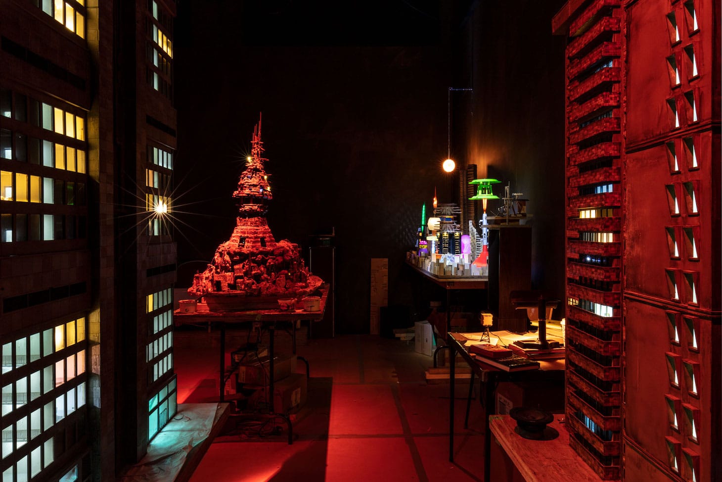 A cathedral-like edifice with exposed, curving beams also seems to be partially in ruins. This includes one of the installation’s rare instances of a human form. A tiny female figure (she looks a bit like Cardiff), standing inside next to a loudspeaker, seems engulfed by her surroundings and utterly lonely.