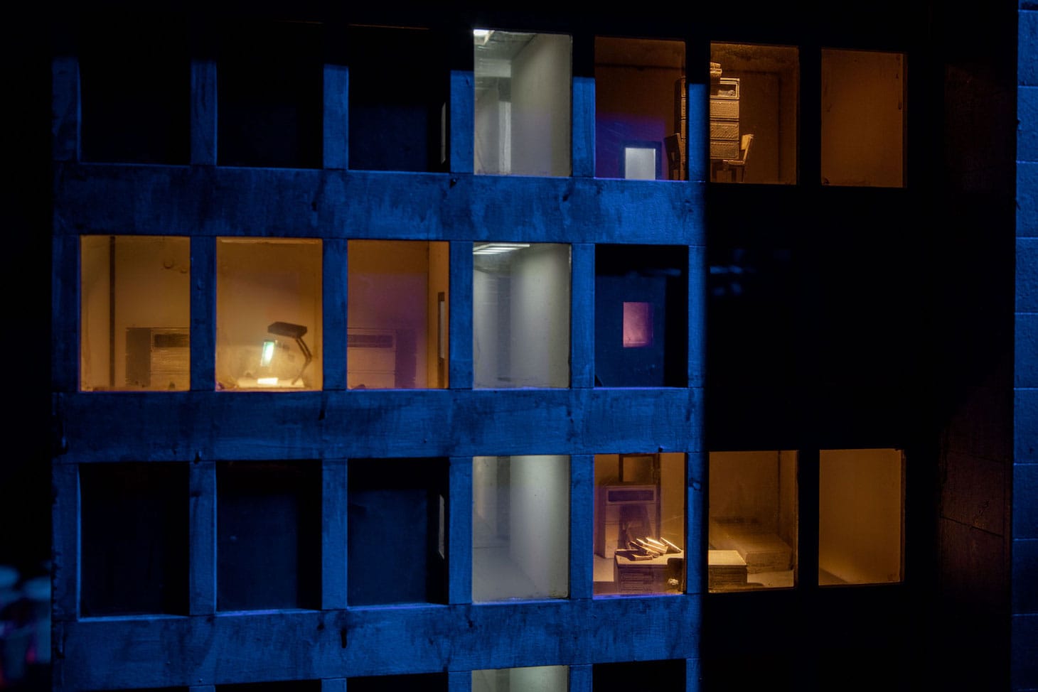 One can peer through the windows of two office/apartment buildings into interiors with expertly rendered dollhouse furniture and decor; sometimes the furniture is askew, suggesting a fight or another upheaval. Miniature paintings and sculptures abound, including a somewhat awry version of Cardiff and Bures Miller's renowned 2001 sound installation “The Forty Part Motet.” Signs of human life are everywhere, but there are no people. Especially in the current moment, marked by so many hospitalizations and deaths, this glaring absence is unnerving.