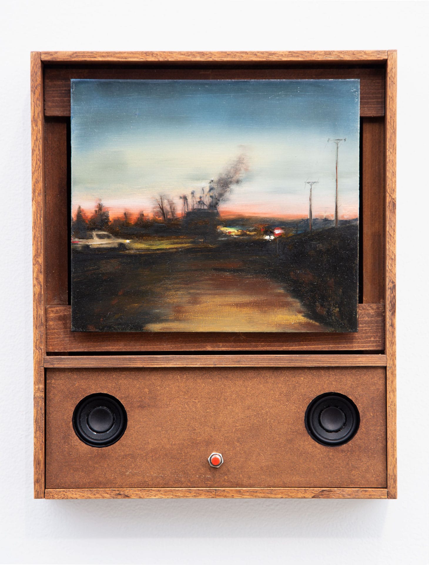 Two exquisite landscape paintings by Cardiff are at the entrance, each set in a handsome walnut frame. Who knew that Cardiff, so identified with sound, has such painterly chops? I certainly didn’t, and I’ve been following her work, and her collaborations with Bures Miller, for many years.