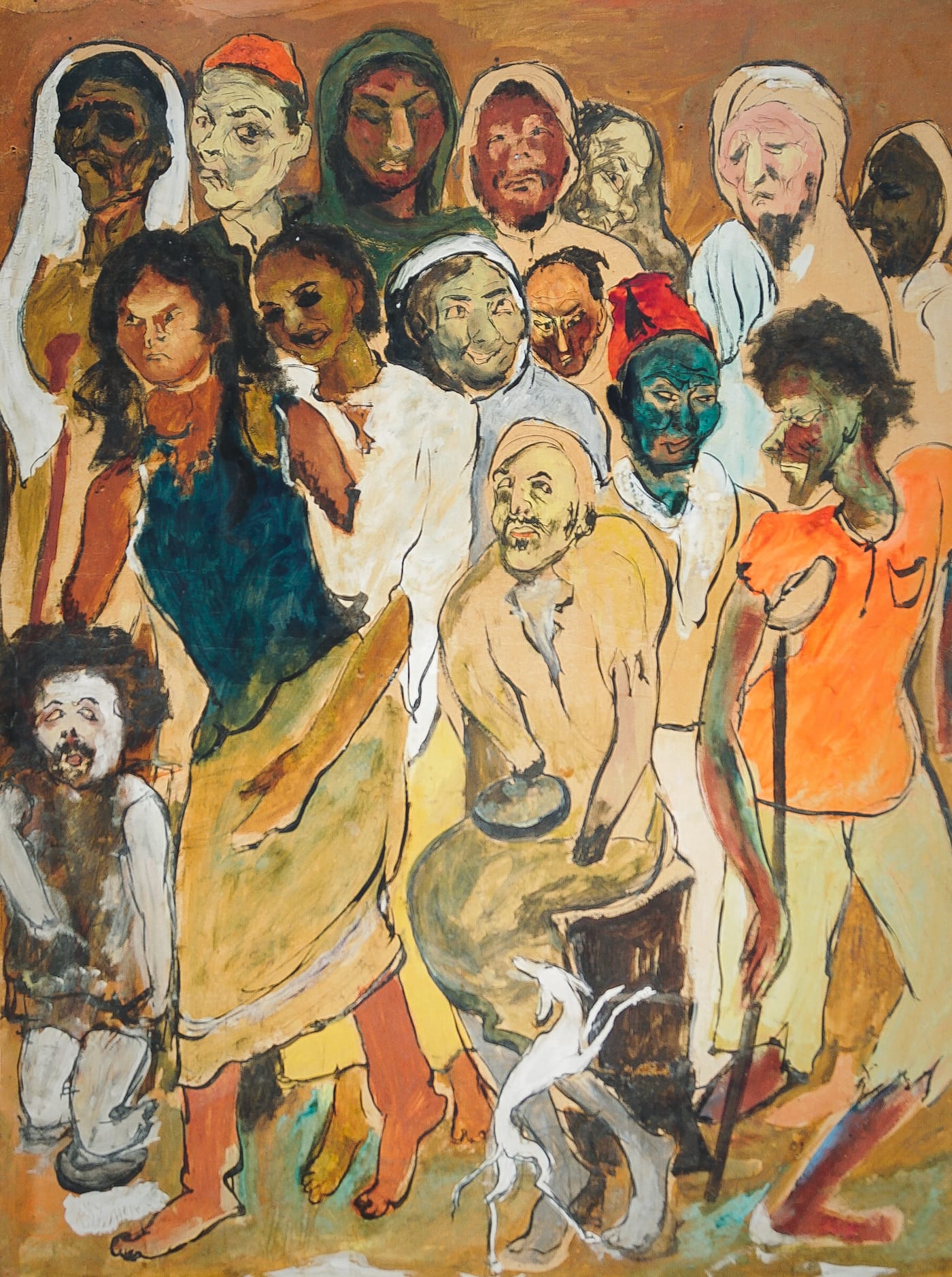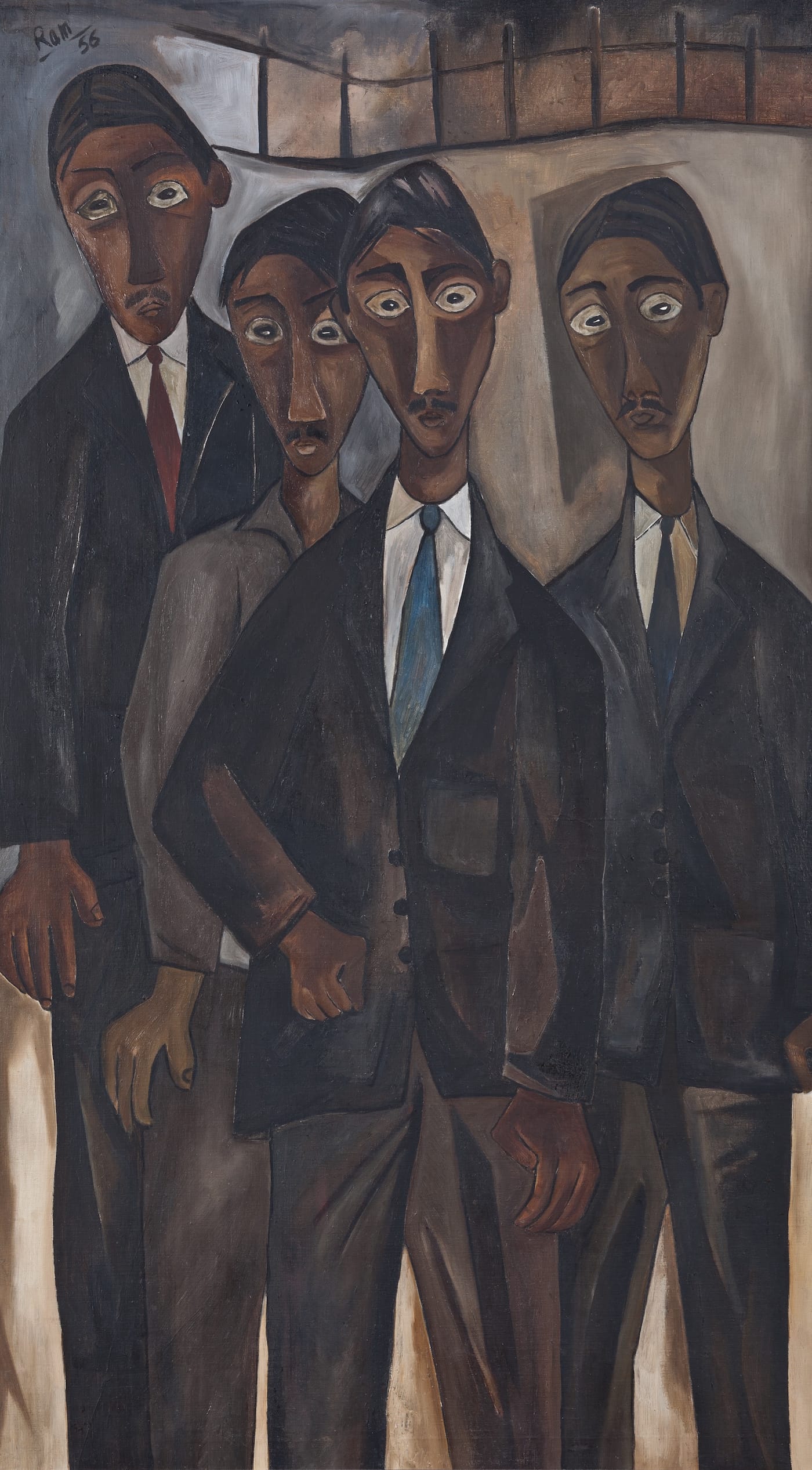 Unity takes on a different tone in Ram Kumar’s strikingly affective painting “Unemployed Graduates,” created eight years later, in 1956. This work is less about solidarity and more about mass alienation in the modern cityscape. It’s symbolic of a growing distrust of Nehru’s rapid industrialization and modernization of India, and conveys Kumar’s skepticism of urban living. Like starved and lost children, his graduates aimlessly gaze toward the viewer for direction. This is hopelessness made material, an increasingly abstract rendering of human strife.