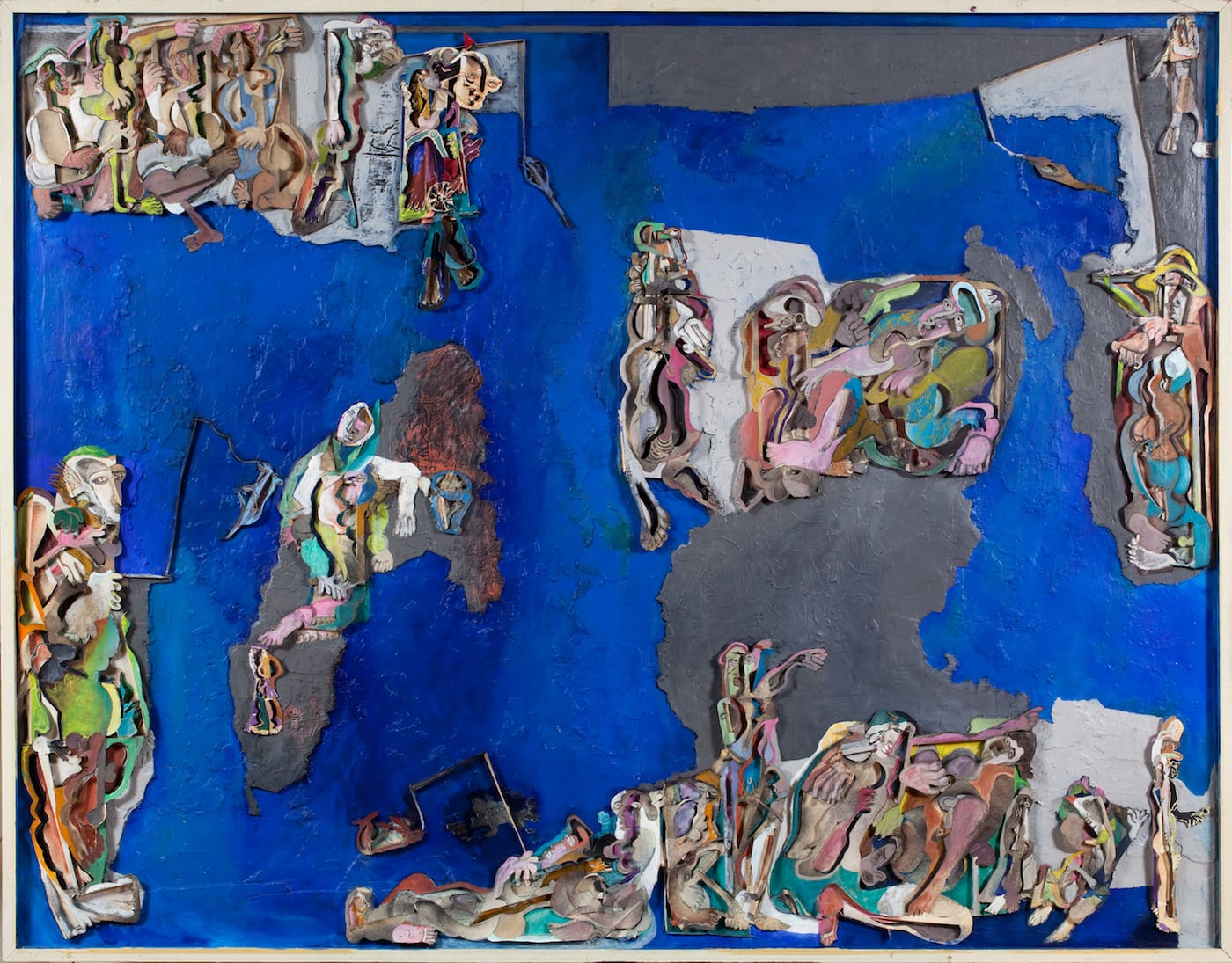 My favorite work in the entire exhibition is also technically an outlier. “Midnight Fishing Party” (1974) was created by Mohan Samant, an artist who’s often left out of the PAG legacy although he was invited into the group by Ara in 1952. Samant’s work is a mixed-media delight, spinning together Hindu myths, Christian symbols, African rituals, and Egyptian motifs. The forms in his work are complex paper cutouts delicately folded into a myriad of figures, apparently referencing Indonesian shadow puppetry. There is just so much in this single work to see: gestures to Picasso’s “Guernica” (1937) composition; the visual depth of the deep-blue sea; the underwater topography. Like most of the works in Progressive Revolution, one could scan this canvas for hours and never grasp the entire significance of its meaning. The story of Indian modernism, it appears, is far from over.