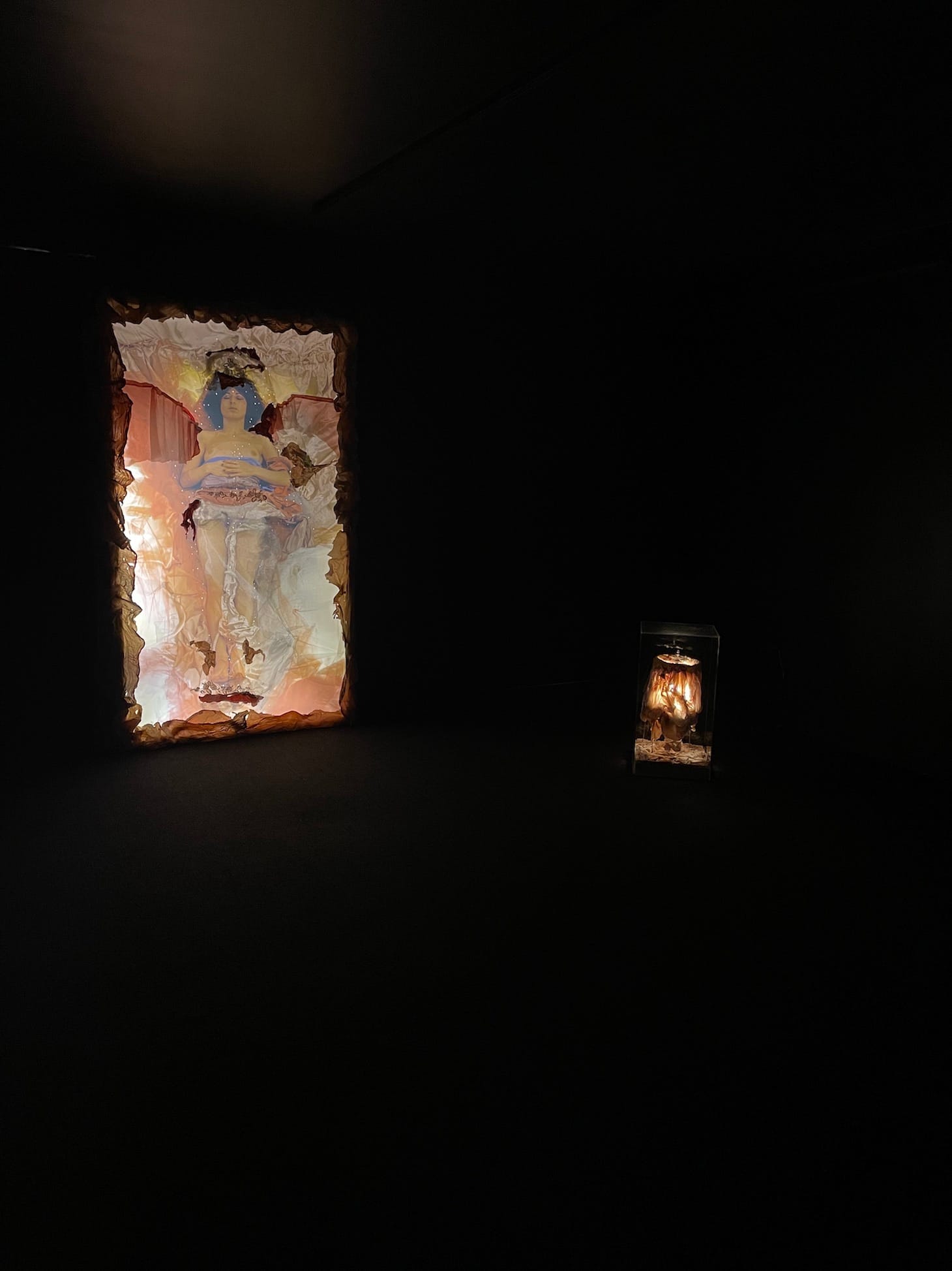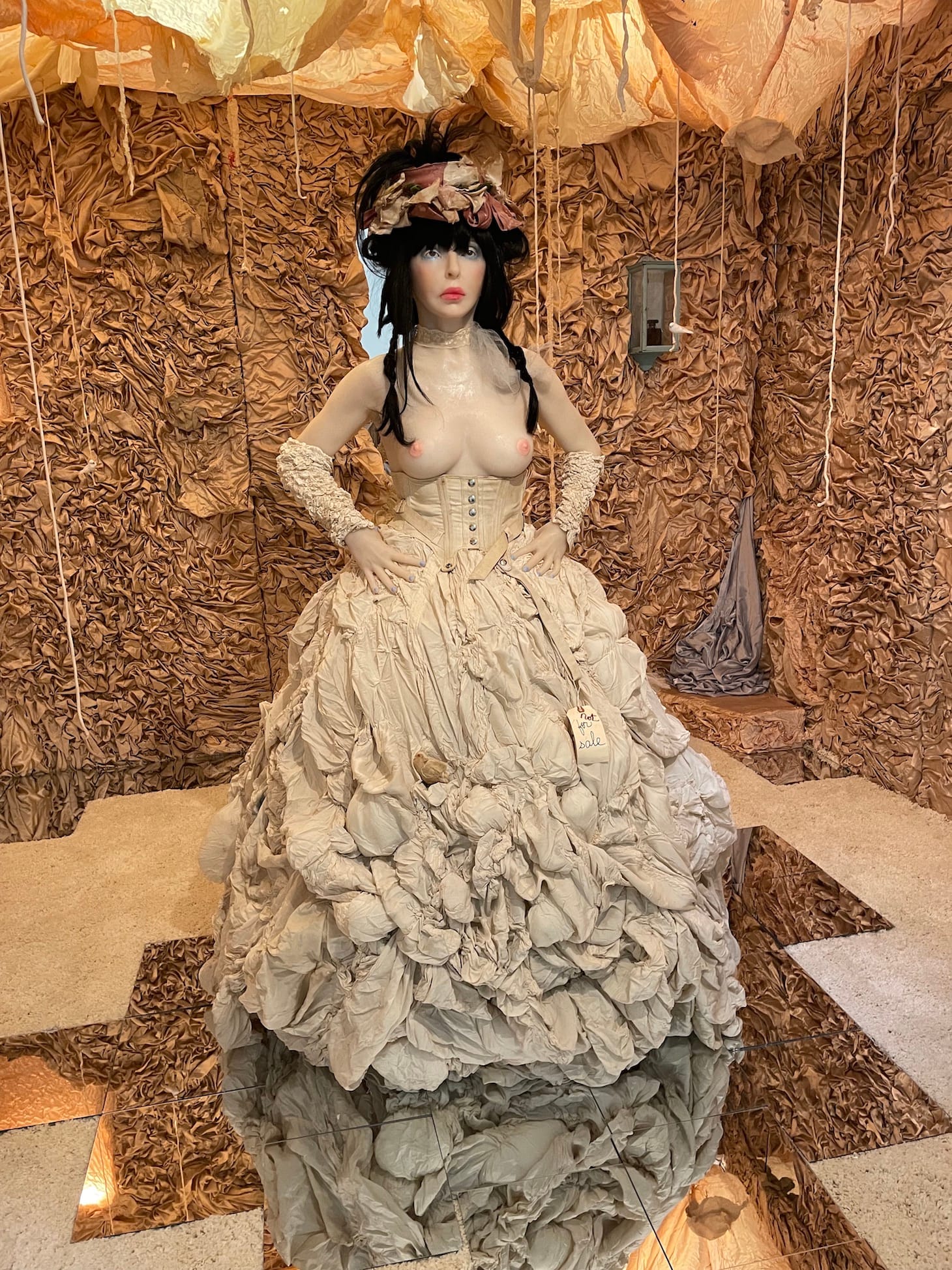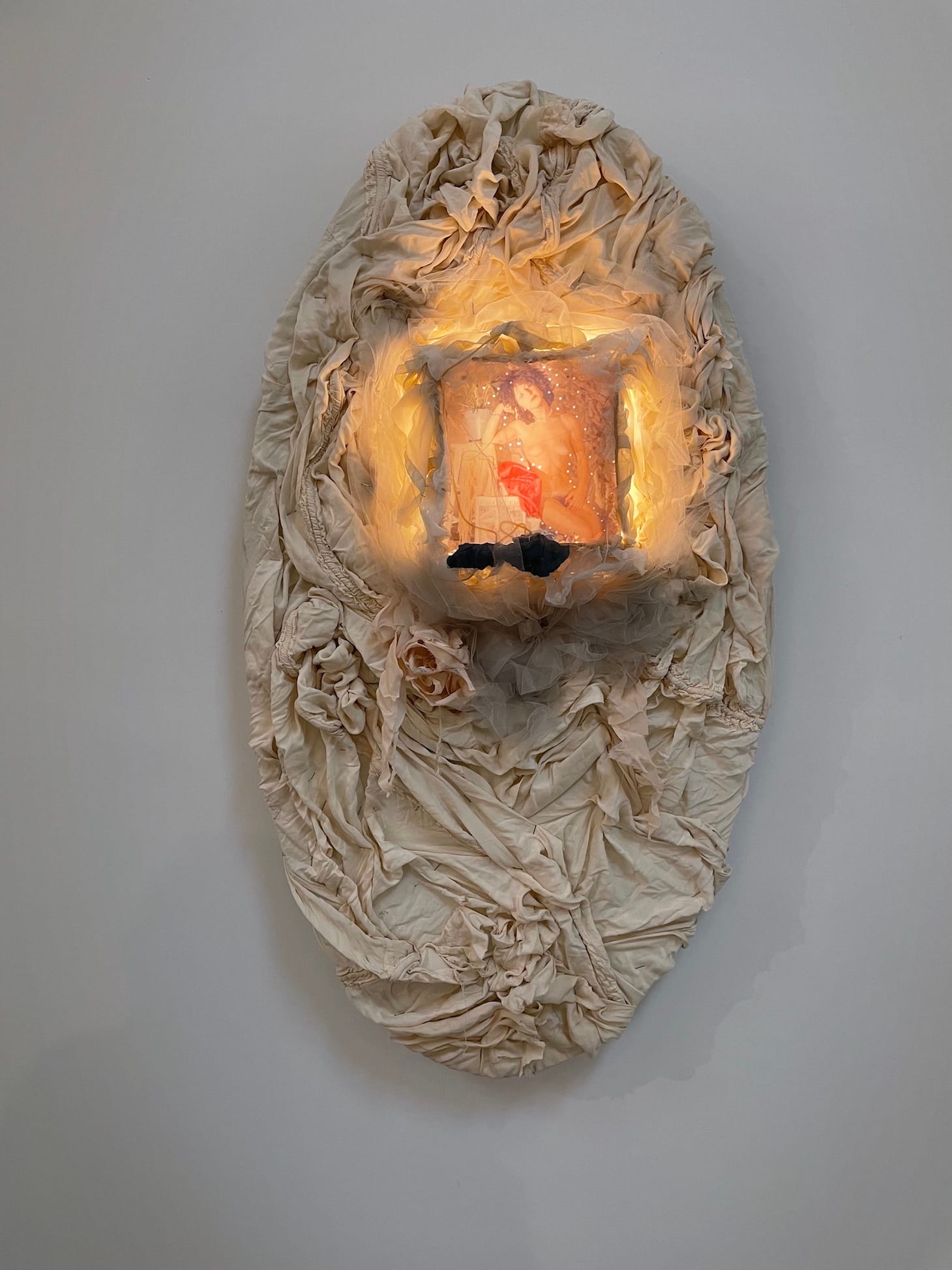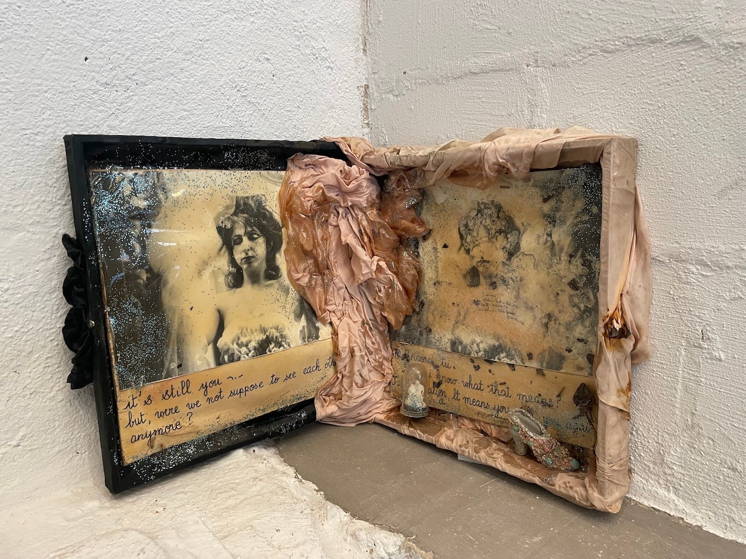 Before Tilda Swinton ever slept in the glass box constructed by Cornelia Parker at MoMA, Colette incorporated sleep as an endurance practice in several of her performances. Between 1972 and 1983, the artist created a gesamtkunstwerk by turning her downtown loft into what she has termed “a living environment,” an immersive installation in which she herself is activated as a living sculpture. The current exhibition at Company gallery, Notes on Baroque Living: Colette and Her Living Environment, 1972-1983, curated by Kenta Murakami, takes the latter as its foundation. Entering Colette’s reconstructed living environment feels like stepping into a dreamlike universe saturated in a palette of crème and light pinks. Spread throughout the gallery are mixed-media wall fragments, light boxes, sculptures, garments and objects, as well as film footage and framed postcards. In Colette’s world, the theatricality of Versailles meets the punk ethos of the Sex Pistols, and ruched silky fabric is a signature material that you can’t possibly have too much of. The artist’s own likeness is omnipresent; photographs are embedded in the majority of the pieces, and her image is featured in the performance announcements and documentation. A large sculptural installation titled Notes of Baroque Living (1978-1983/2021), reconstructed from original elements of her living environment, centers a life-sized doll sculpture of Colette, made in collaboration with Company artist Cajsa von Zeipel.