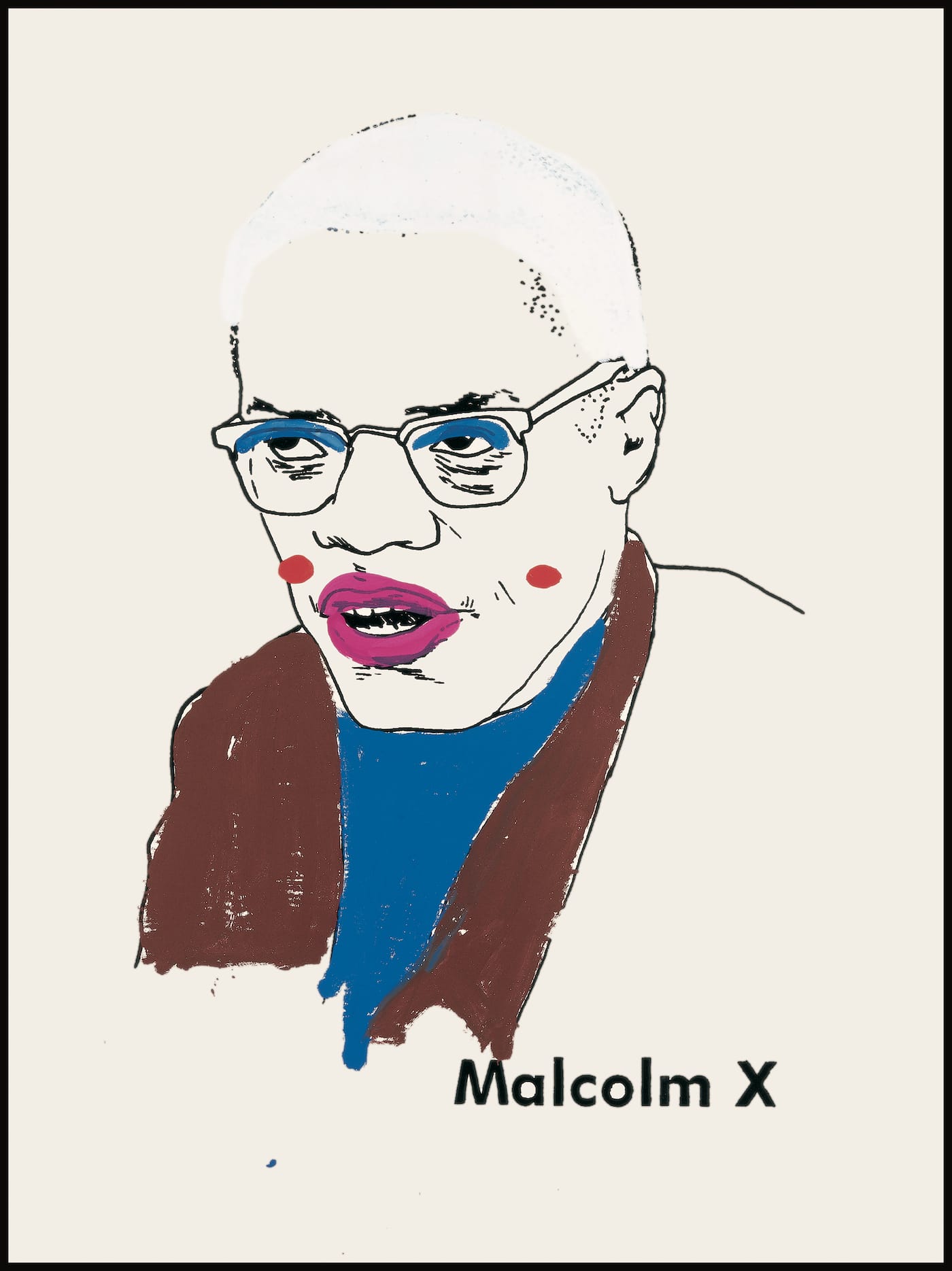AE: I have been reading The Autobiography of Malcolm X, and it’s such a powerful read, but also the amount of misogyny is staggering. I’ve had your book and that book side by side on my desk for a while, and I’ve just been looking at the covers — the queered version of Malcolm X, with red lipstick, blush on his face, and blue eyebrows under his ’50s hipster glasses, against the original one of him looking stern and visionary, gazing off into the distance. I’m curious about your decision to put this image on the cover. How do you feel it reflects the contents of the book?