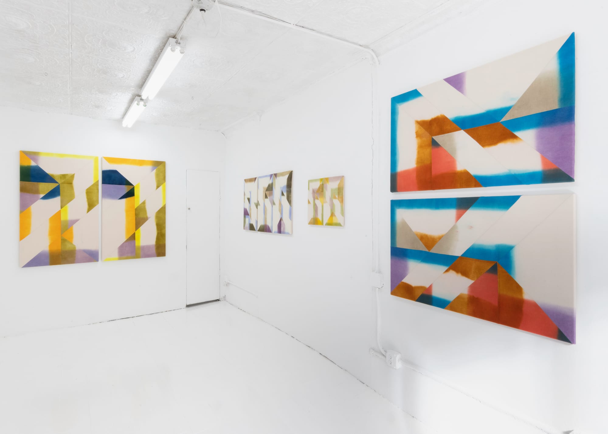 First soaking wool blankets in dye baths, allowing a palette of four to six colors to stain the fabric, Alison subsequently cuts up the blankets and sews them into new compositions that emphasize the diagonal seam, aka slash. A subtle yet poignant critique of gendered power structures embedded in language, Alison’s investigation of queer identity through abstract form falls into a growing lineage of queer artists working in abstraction. By creating the slash through the constructive labor of sowing the wool surface back together, Alison counters the long history of male artists’ enactment of destructive slashes, such as Lucio Fontana’s famous slits, made by the artist literally cutting into the canvas. Alison’s approach to visualizing a split through the act of merging is equally paradoxical as it is poetic.