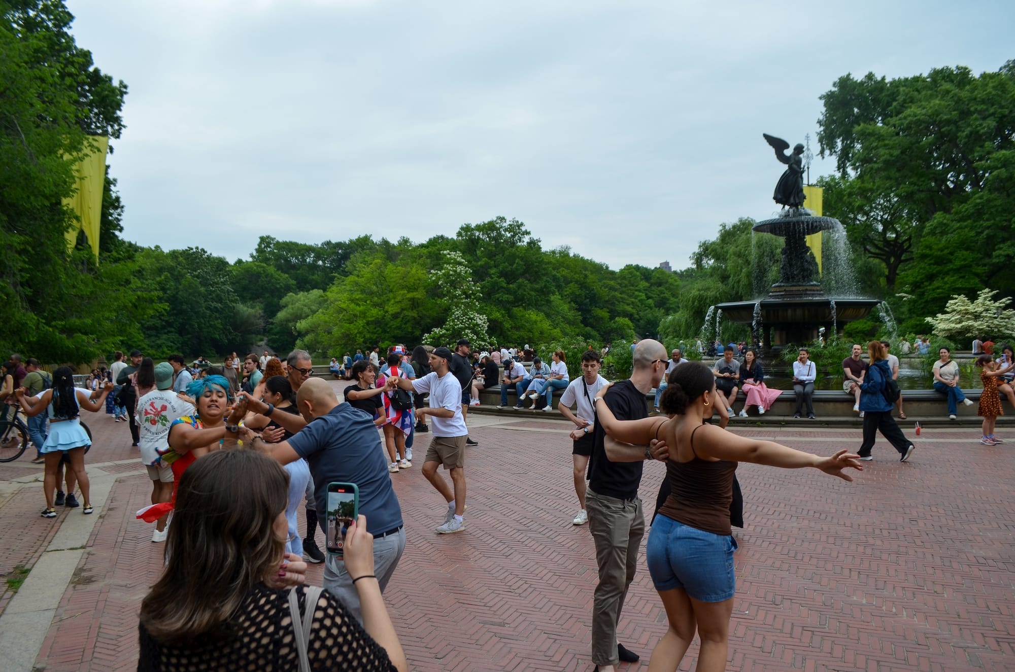 Off to one side of the Bethesda Terrace, one of the most photographed sites in Manhattan's Central Park, visitors gathered for an impromptu salsa dancing session on Sunday, June 15, against the backdrop of "Angel of the Waters," the sculpture that forms the centerpiece of the landmark fountain. Tourists crowded nearby, capturing photos of the artwork against the lush surrounding greenery.