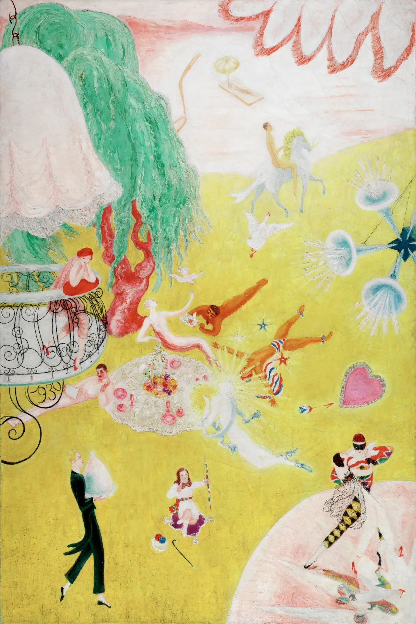 “Love Flight of a Pink Candy Heart” (1930) extends the queer utopia of Stettheimer’s oeuvre in its subversion of romantic love tropes. In the lower center of the composition, she paints herself as a child, shooting Cupid’s arrow after a lace-trimmed Valentine’s heart that floats through a yellow meadow of young, beautiful figures. While some of them are possible portraits of Stettheimer’s former love interests, there are also references to members of the LGBTQ+ community, including a portrait of Demuth, dressed in white, and fictional characters that represent her close friend, the photographer Carl van Vechten. Duchamp makes a cameo as the harlequin at lower left, dancing with Stettheimer herself. These figures blend reality and fiction, quite literally, in an unbound elision of sexual, romantic, and platonic love. The painting is earnest and nostalgic yet self-aware: “It seems to me that Florine is laughing a little at herself,” her sister Ettie observed when she donated the painting to the Detroit Institute of Arts.