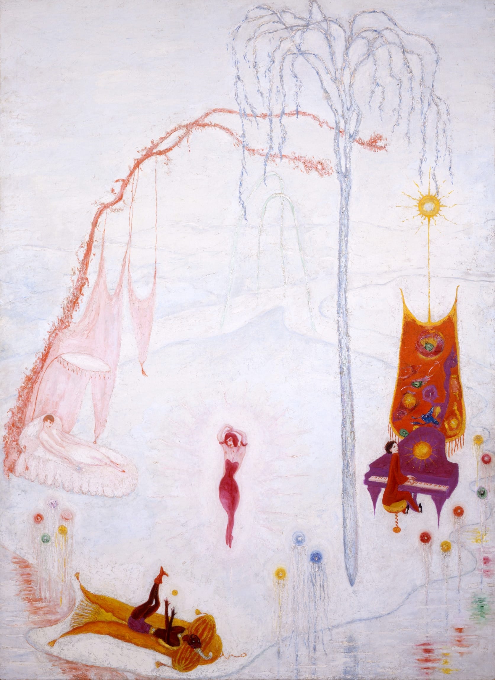 Stettheimer treated her studio in the Beaux-Arts Building in Manhattan, overlooking Bryant Park, like a three-dimensional extension of her painted worlds, filling it with her artworks and furniture she designed and often painted herself. Her bed, for example, was covered in a massive lace canopy, like the one she painted over her sleeping self-portrait in the c. 1920 painting “Music." These parallel details allow one to imagine the Ballets Russes dancers in “Music” — like Vaclav Nijinsky, at center, radiant and feminine in a pink circle of light — as both fantastical figures and real people at home in Stettheimer’s studio.