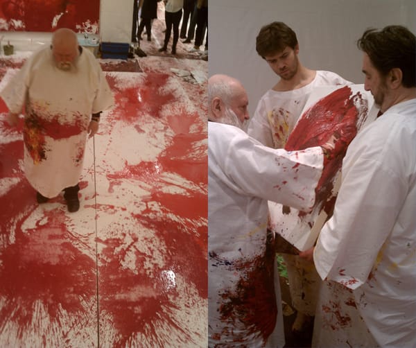 Speaking of sacrilege, who’s spiritual transcendence are we striving for? 60. Painting Action // 60. Malaktion wasn’t as explicit as the Orgies Mysteries Theatre‘s drive toward communal ascension. Nitsch fell into moments of noticeable trance at each stage of the process. Ritual, however, relies upon the presence of all involved. The procession upon the canvases became a glaring paradox. Although it calmed the room, reducing the soundtrack to the pitter-patter of moist toes on stale paint, each walk distinguished the discrepancies between the focus of the more experienced apprentices and the gallery-recruited help. Nitsch’s face read amusement and disgust as the staff photographer acquired a robe for protection on the first day, confirming my suspicion that he yearned for a collective mentality. Nitsch necessitates a united mind-frame considering his assistants assume significant hands-on responsibility in the composition of each piece. Unfortunately, several instructional slip-ups occurred. In his separation from certain components of the process, I wonder if Nitsch finds himself tapping into the ethereal as fluidly as he used to, or even at all.