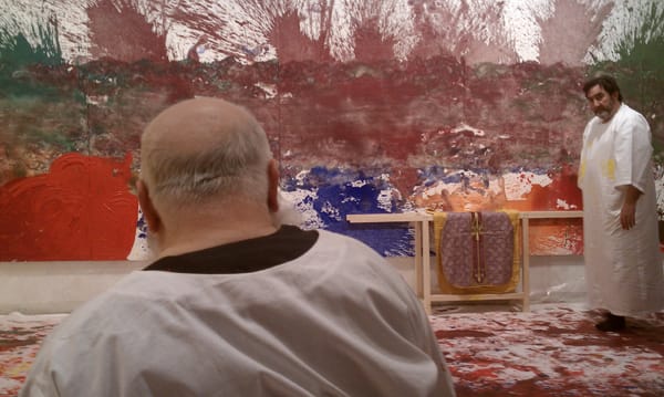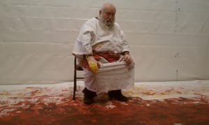 Hermann Nitsch's performance at Mike Weiss Gallery on February 15th and 16th was a historical moment, summoning the exuberance of his context while disintegrating the mystery shrouding his practice. After stalking Nitsch's every movement for close to fourteen hours, the legend was humanized. Yes, th