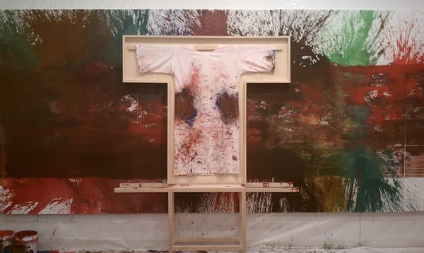 The autumnal collection of yellow paintings in the farthest room of the gallery were procedurally unique in that they avoided the footsteps of Nitsch’s posse entirely. After Nitsch’s tempestuous groundwork, his assistants smeared marigold and aureolin yellow onto the composition. The splatters of paint from hours earlier were completely obscured, the aura jostled. Such simple destruction breeds a revitalized sensuality for Nitsch, unnerving the consciousness. The role of color, however, was a bit less clear. The golden ecstasy supports an enshrined smock, which similarly fell prey to maize blobs of paint completely obscuring its feeble beginnings. Although the wall is cohesive, the deflated yellow smock seemed blasphemous. Identified as a relic, the garb acquired a forced connection to the accompanying piece rather than maintaining its status as product of the action. It was an enforced memorial of the lemon-drop assemblage.