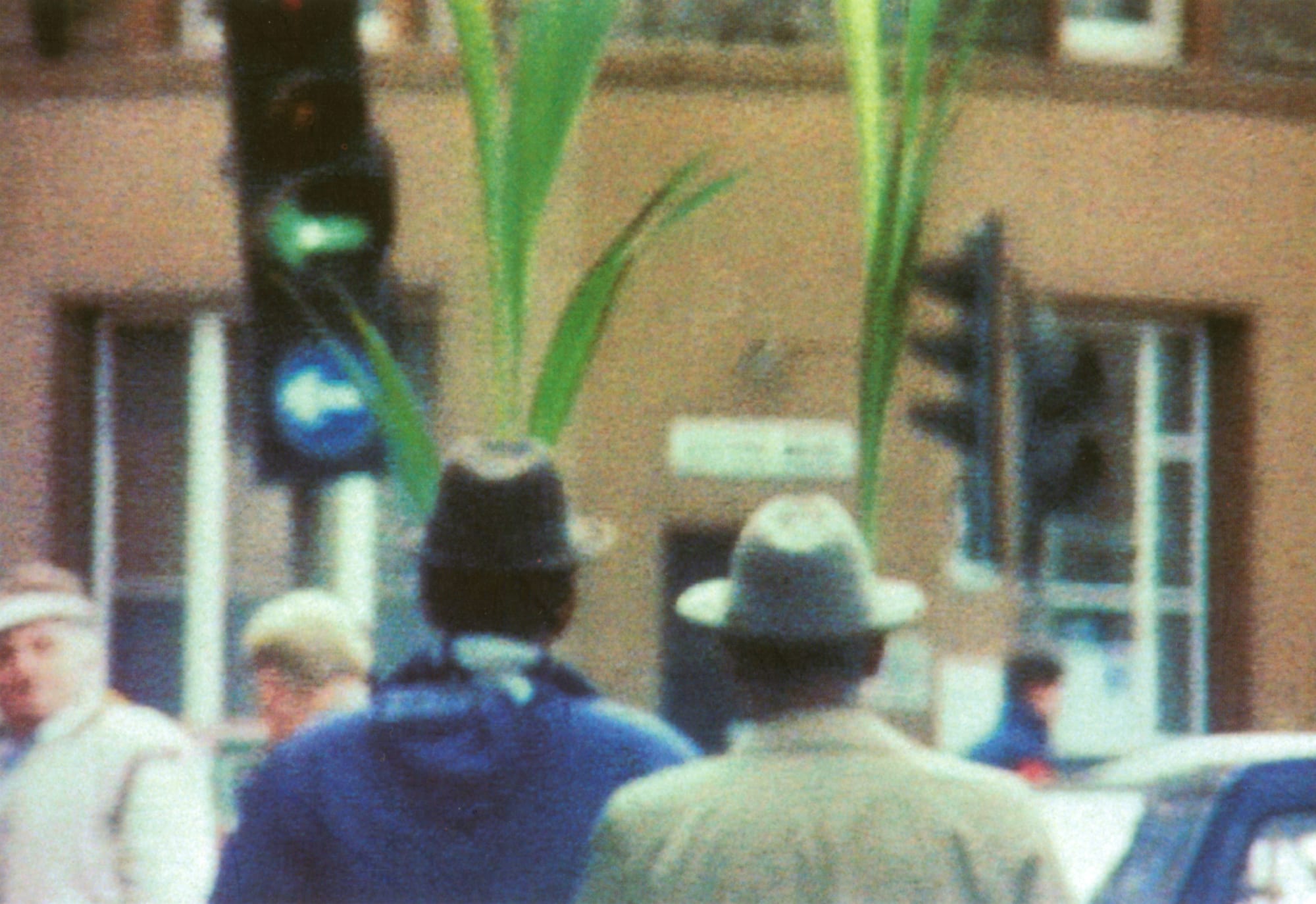 We begin in Chelsea with “Bounty” (2024), a set of 47 photographs of flowers growing on the island of Grenada. Each saturated inflorescence is isolated in shallow focus, as if offering its beauty urgently. Lining three sides of the gallery, the work is met by “Exodus” (1992–97) on the fourth, a short film of twin coconut palms bobbing through London’s Brick Lane Market, carried by two West Indian men in fedoras. You can feel the rush of discovery as McQueen, then a student at Goldsmiths College, first notices the men and struggles to keep up with his camera.