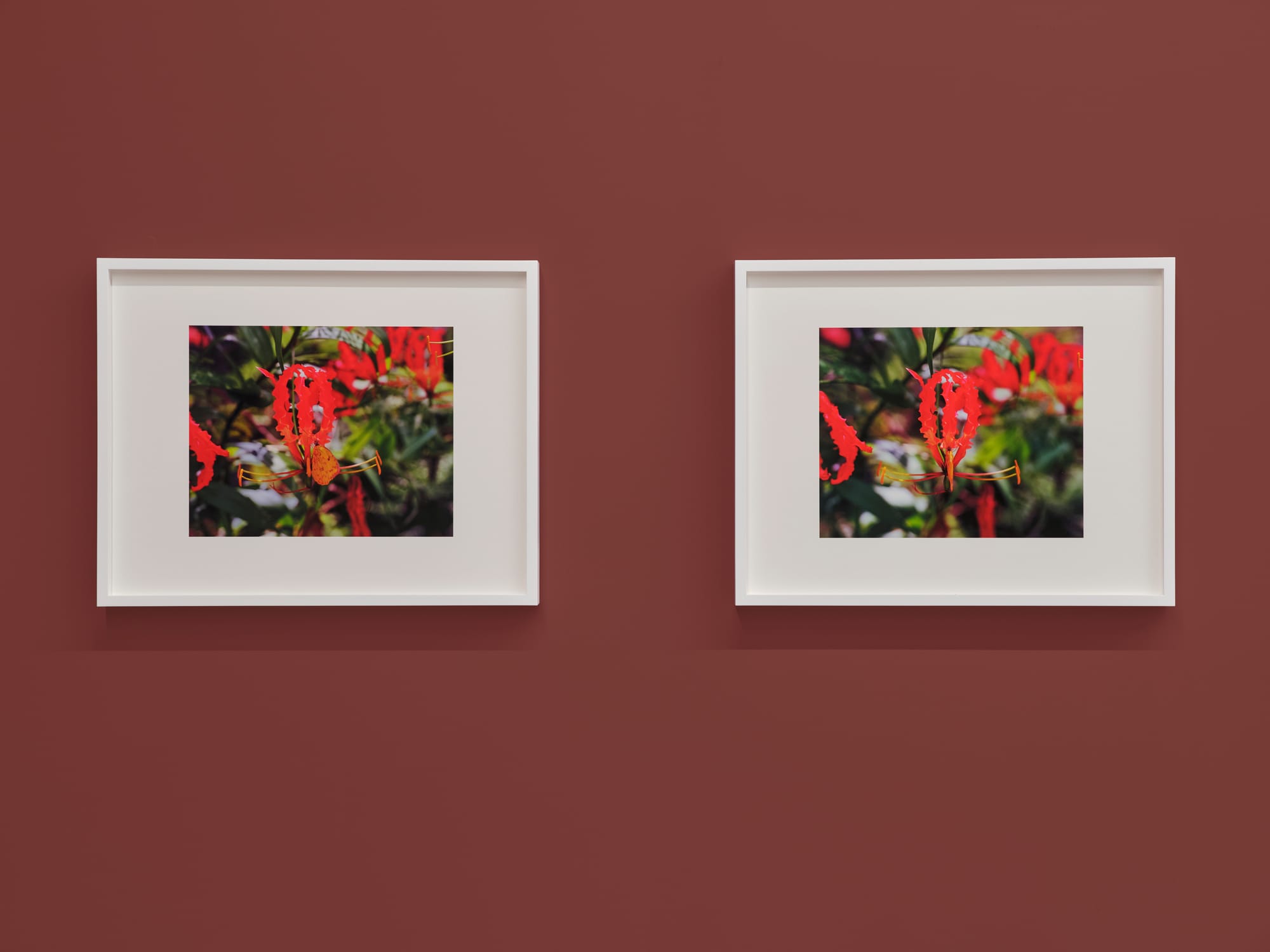 Much like B-roll in a film, “Bounty” enhances the nature and context of his father’s Grenada. The images recall Eliot Porter’s startlingly clear photographic plea of In Wildness is the Preservation of the World (1962), though McQueen’s beauty is of a darker variety. In a conversation with Dia curator Donna De Salvo, McQueen spoke of the flowers’ perverseness, alluding to all they have witnessed. “Bounty,” as in the generosity of nature — but also “bounty” as in a reward paid to slave catchers for capture or kill. The entire series is one work, the order decided upon installation, and McQueen neither specifies individual flowers’ taxonomy, nor suggests any symbolism. But several are arresting. When facing “Exodus,” third from the right on the left-hand wall is a splayed bromeliad, its spattered red leaves stunted by rot. Water pools in its center and the plant appears radioactive, even threatening. Directly opposite, third from the left on the right-hand wall, a single duranta hovers so close it appears stuck on the surface, every detail of its papery petals palpable as the sun shines through its violet bloom. Rendered in inkjet on sheets of aluminum composite that fill the frame, the flowers appear flattened, within reach and yet not entirely of this world.