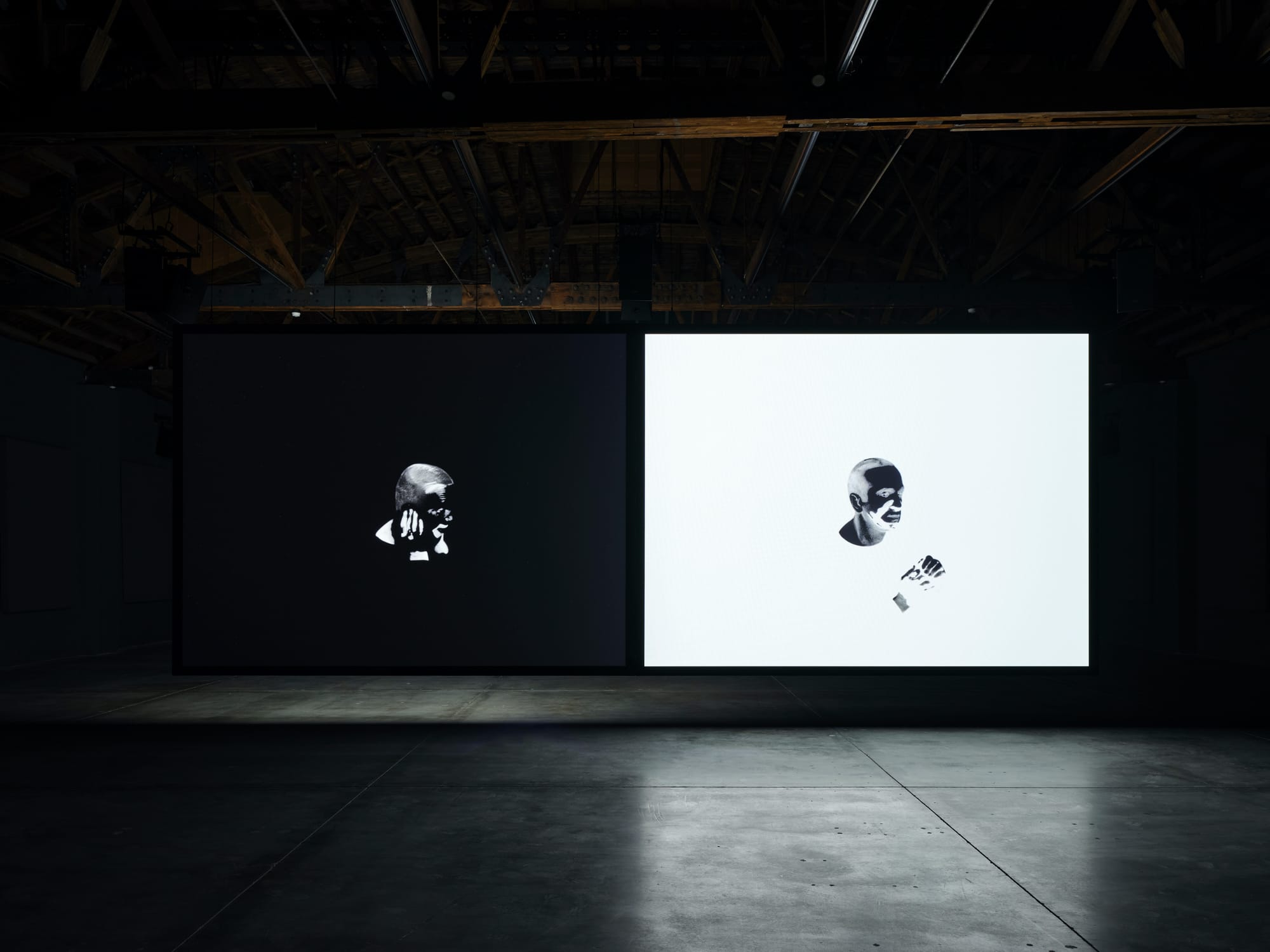 Meanwhile, in the lefthand channel, actor Al Jolson dons blackface in negative, erasing himself. As he performs, headless, his open arms cast fugitive, abstract shadows. Then, his image doubles, and both channels start to toggle between positive and negative. Is he donning blackface or furiously scrubbing his face off? Whichever it is, he does so faster and faster until — cut to an image of the sun. It swirls closer than we could ever get, accompanied by a low hum that builds into a roar. You feel it in your stomach, the sensation so intense it empties you. “Shine on me, Sunshine State,” McQueen rasps, breathlessly, unto oblivion. “Shine on me” — is he asking for the burn or the bask? For the pain or the relief? I am reminded of Dave McKenzie’s “Wilfred and Me” (2012), in which the artist repeats the single line “Magic Johnson has AIDS,” a fact that apparently moved his stolid father to tears, in a similarly cathartic if damaging attempt at understanding a father after death.