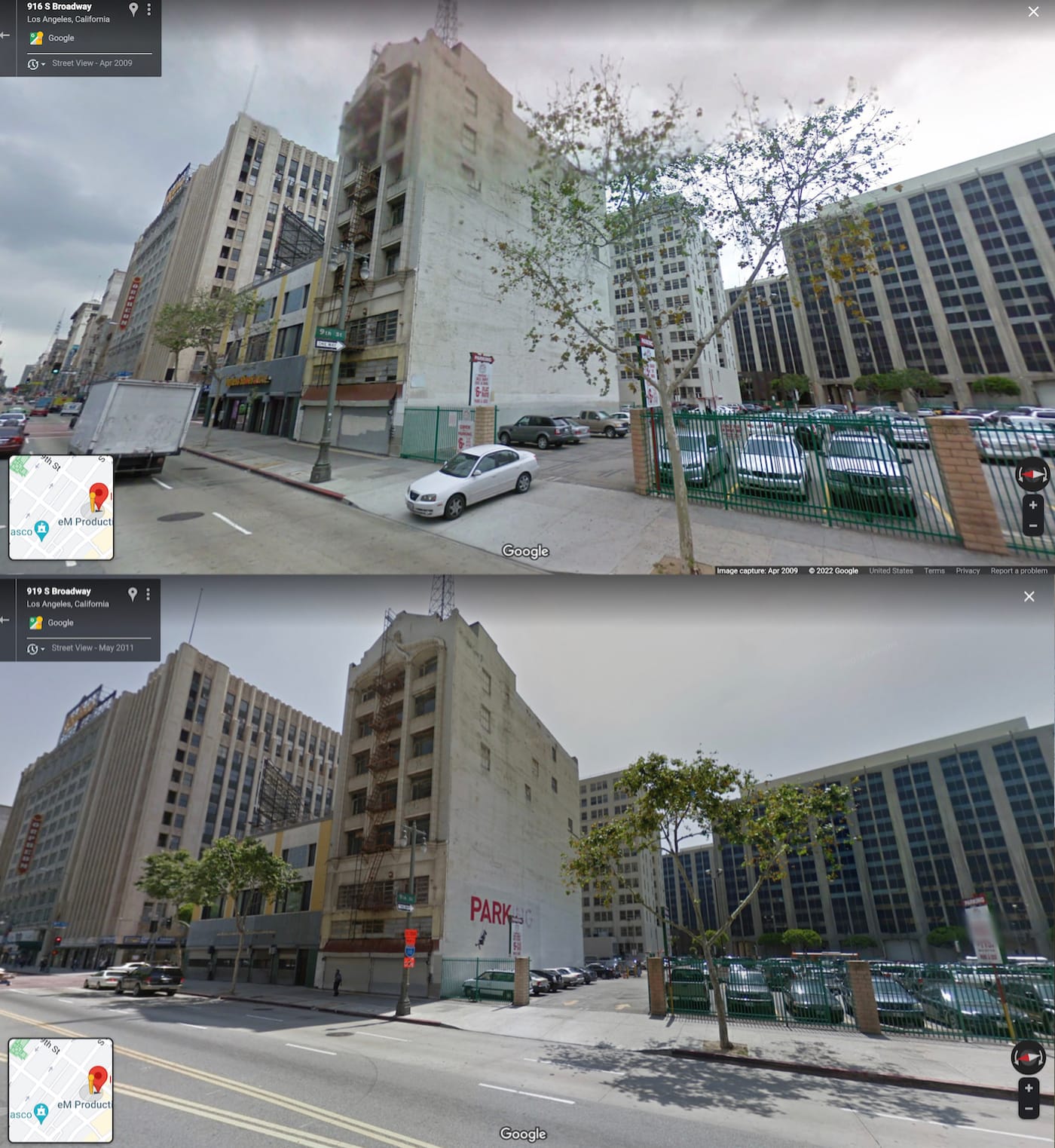 “When it was painted, the wall of 908-910 S. Broadway was the edge of a huge surface parking lot, which Downtown has been filled with since the redevelopment mania of the 1960s. Banksy painted the whole thing — PARK (ing) and the girl on the swing, giving the impression of an intervention with an existing wall sign,” Cooper told Hyperallergic via email. (Google's street view time travel feature backs her up, and Joey Good of Miller Ink, the PR firm covering the auction, told Hyperallergic via email that Tarantino and Campos are "well aware [that] the entire sign is Banksy's work.")