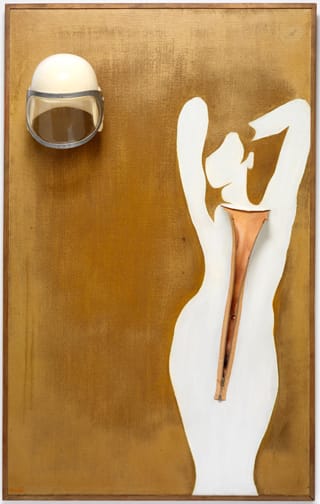 The exhibition focuses on Axell’s interest in space travel undertaken by women. It includes the assemblage painting “Valentine” (1966), which she made in homage to Valentina Tereshkova, who, on June 16, 1963, became the first woman to fly into space. The painting’s gold leaf, spray painted surface includes a white toy astronaut helmet — it belonged to Axell’s son — and a zipper of a white cat woman outfit that the viewer is invited to pull up or down. Behind the zipper, and synonymous with the painting’s skin, is a nude female body, complete with protruding breasts and belly button.
