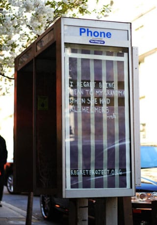 The Regret Project is sort of like Post Secret meets street art. Anyone can anonymously submit his or her “greatest regret,” and the creator of the project then chooses from the pool and turns the most striking ones into paintings, projections and wheatpastes.