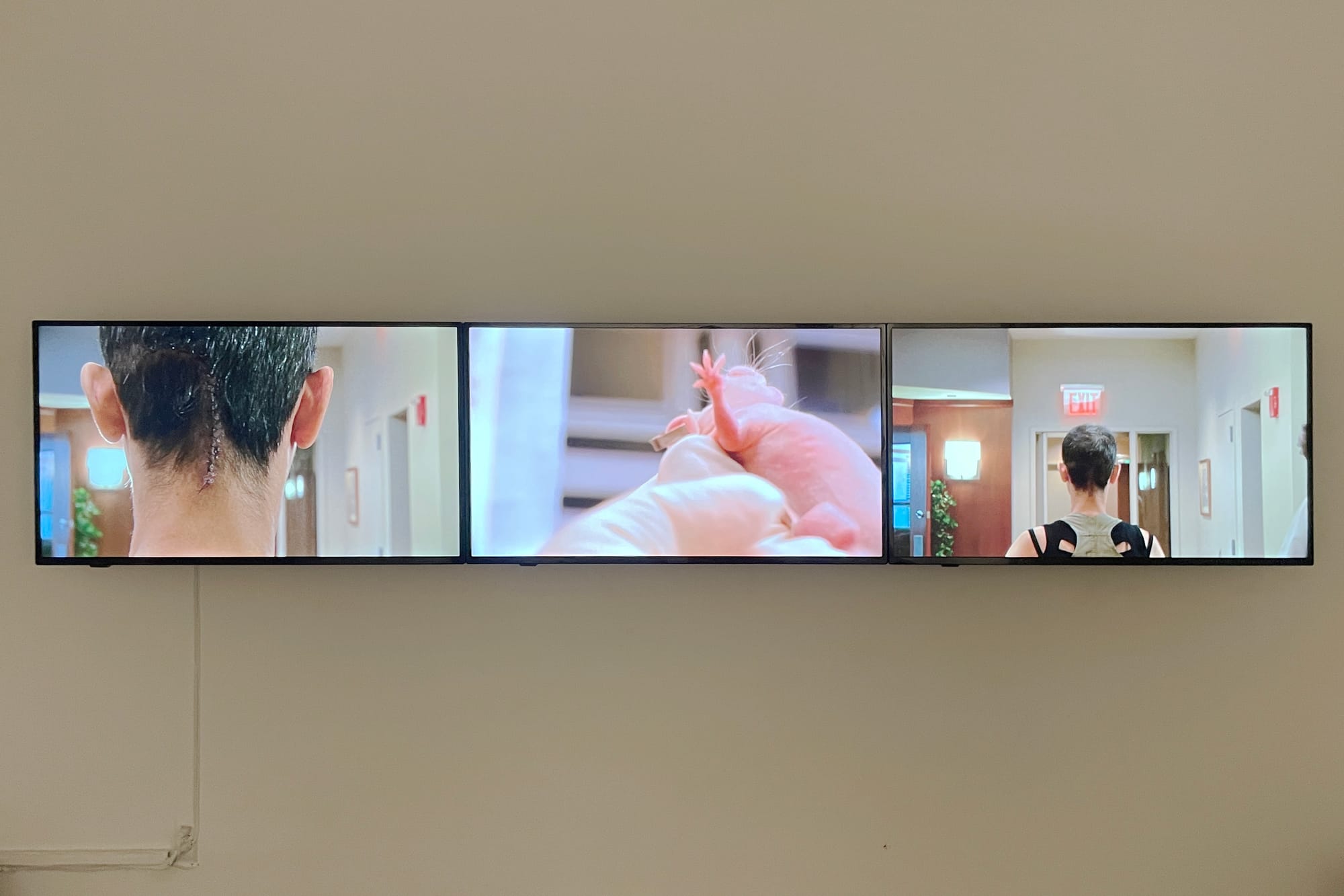 Another work from the series, “Dying for the Other” (2011), moved me more. It shows how da Costa donated her still-living body to science. The video triptych juxtaposes da Costa, who volunteered for experimental treatments, struggling through physical therapy along with footage of lab rats writhing in pain. Scientists had injected the rats with breast cancer cells to study how the disease would affect a living organism — in these videos, we realize that both da Costa and the rats are dying from the same condition. The work brings up the ethics of testing on humans and animals; da Costa’s participation demonstrates that humans can also in some ways be unwilling subjects in medical studies even if not forcefully given cancer in an experiment. Anyone with breast cancer who chooses not to become a specimen, for instance, just ends up reflecting the experiment’s control subjects. By volunteering for the trials, da Costa finds agency by becoming a variable in the study.