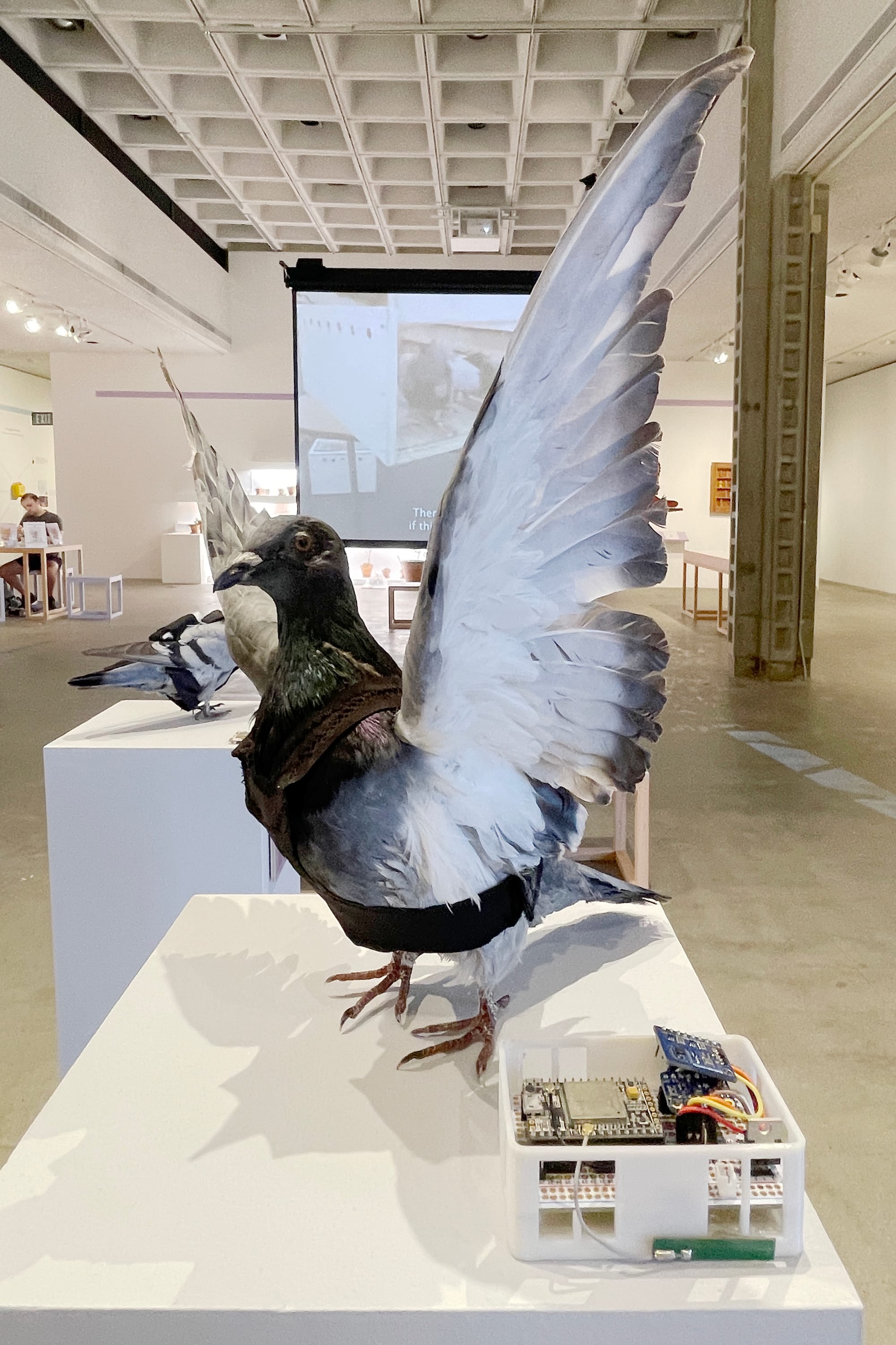 LOS ANGELES — A taxidermied pigeon stands on a pedestal in the Los Angeles Municipal Art Gallery. Its wings are outstretched and a tiny backpack is strapped onto its body. The bird — or one like it — was once a scientist.